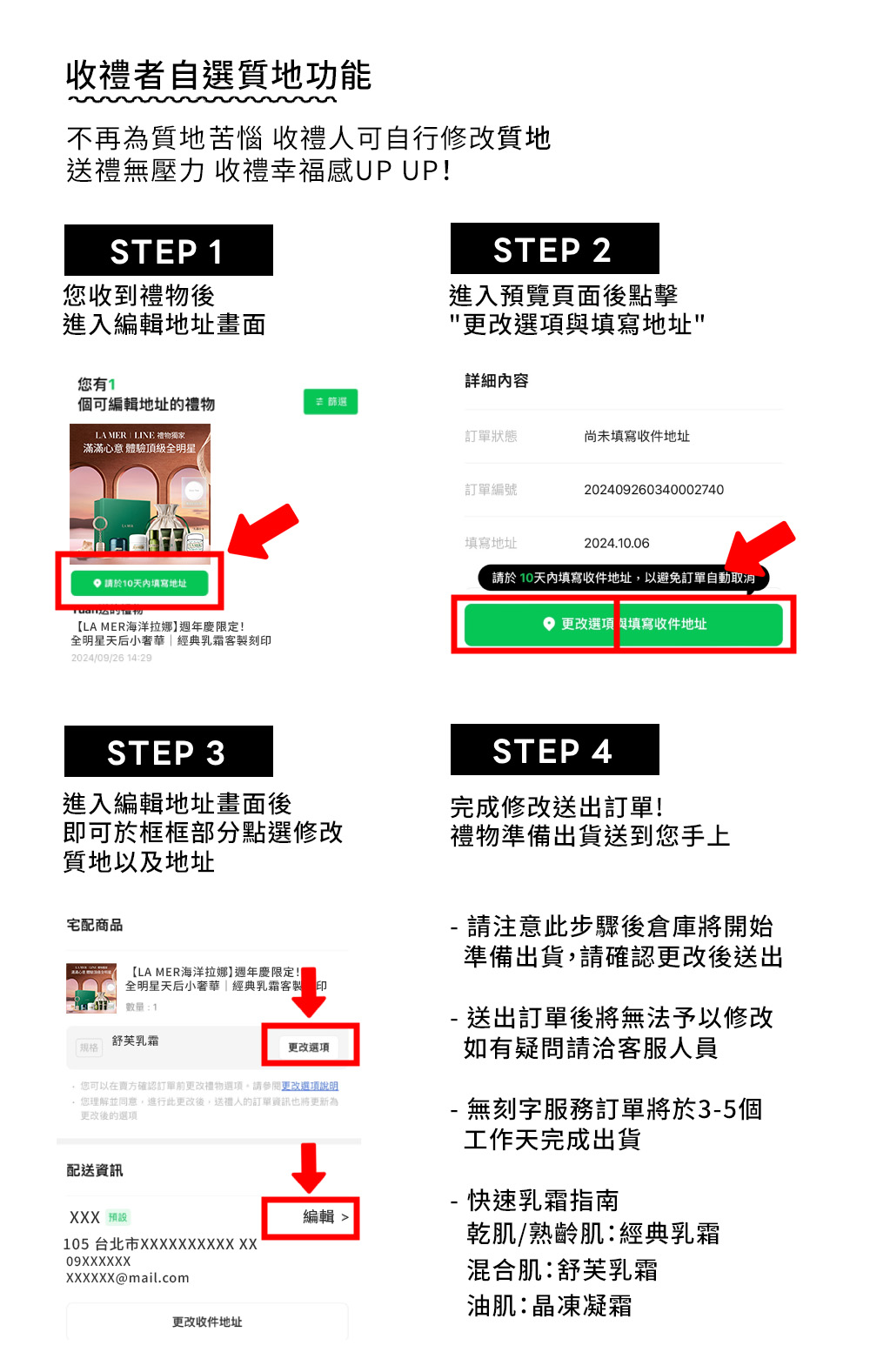 ・送禮訂單,若在成立訂單時未填寫收件者地址,收件者可以至LINE禮物 /我的 / 我的禮物 / 點擊商品 / 填寫地址。若在成立訂單後10天內未填寫地址,則訂單將自動取消。