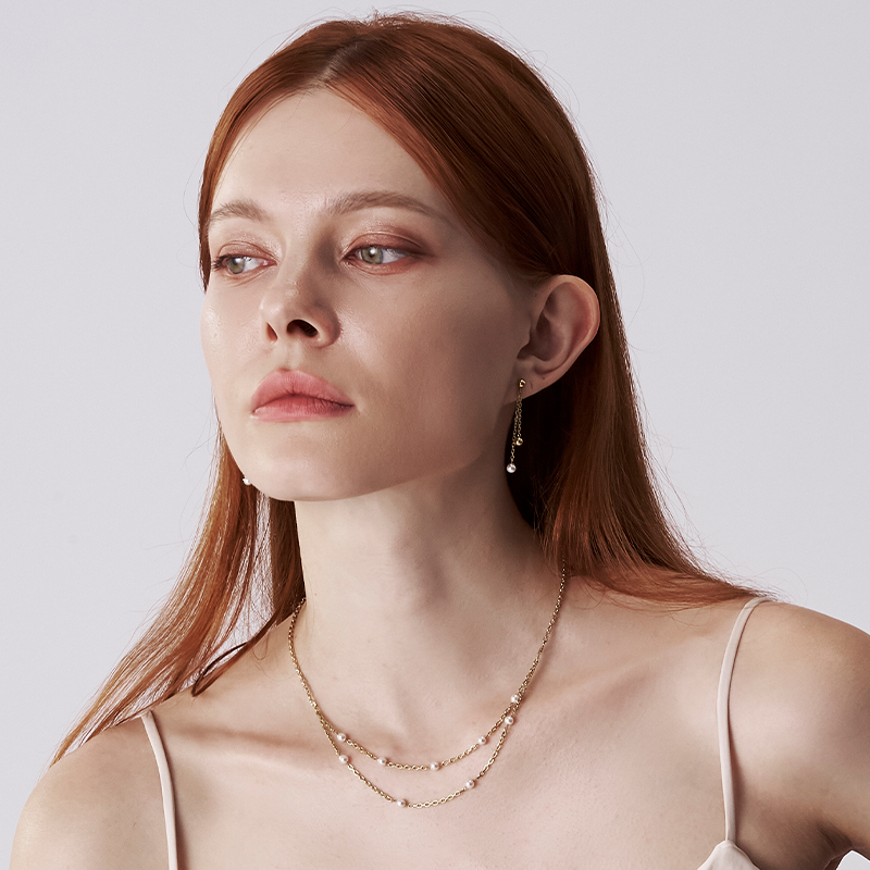 雙鍊條點綴交錯 4mm 珍珠的經典項鍊,伴隨手腕動作與時間的流動中
