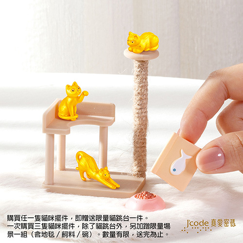 備註1:購買任一隻貓咪擺件,即贈送限量貓跳台一件。一次購買三隻貓咪擺件,除了貓跳台外,另加蹭限量場景一組(含地毯/飼料/碗)。數量有限,送完為止。