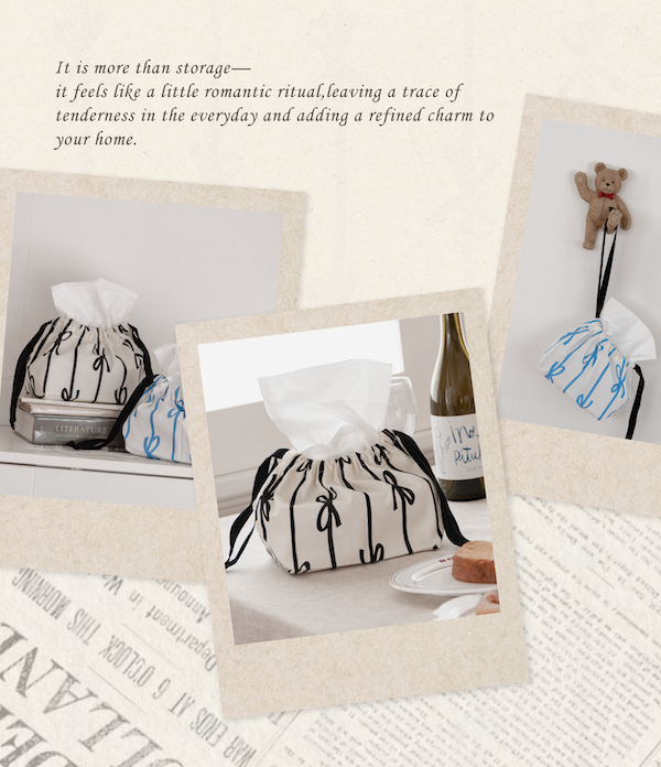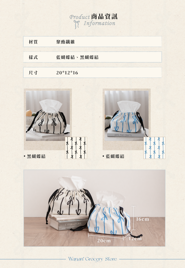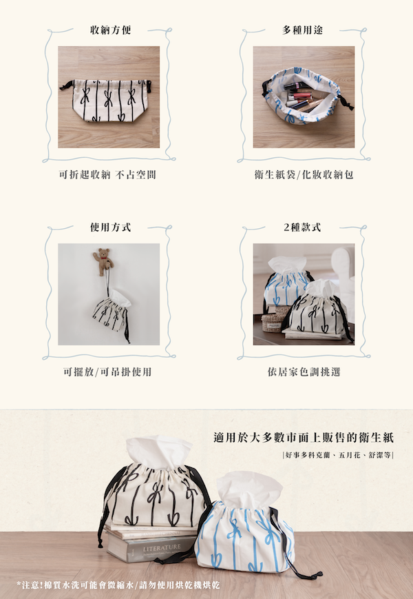 晚安你好有些東西就是明明是收納袋,但你就是想一直看它。這款蝴蝶結束口袋就是那種——又可愛又實用的剛剛好。好市多的衛生紙直接放得下,不誇張,要是你不想拿來裝衛生紙,也可以當化妝包、雜物袋。繩子是可以調的束口設計,掛在牆上也很可以,藍色跟黑色蝴蝶結都很好搭,是那種越看越順眼,越用越喜歡的小東西。⚠️下水後就無法退換貨!務必檢查過再讓他洗澎澎🛁