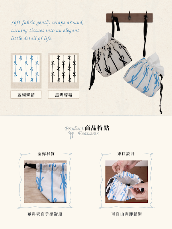 • 束口設計,可依照衛生紙數量自行調節鬆緊大小