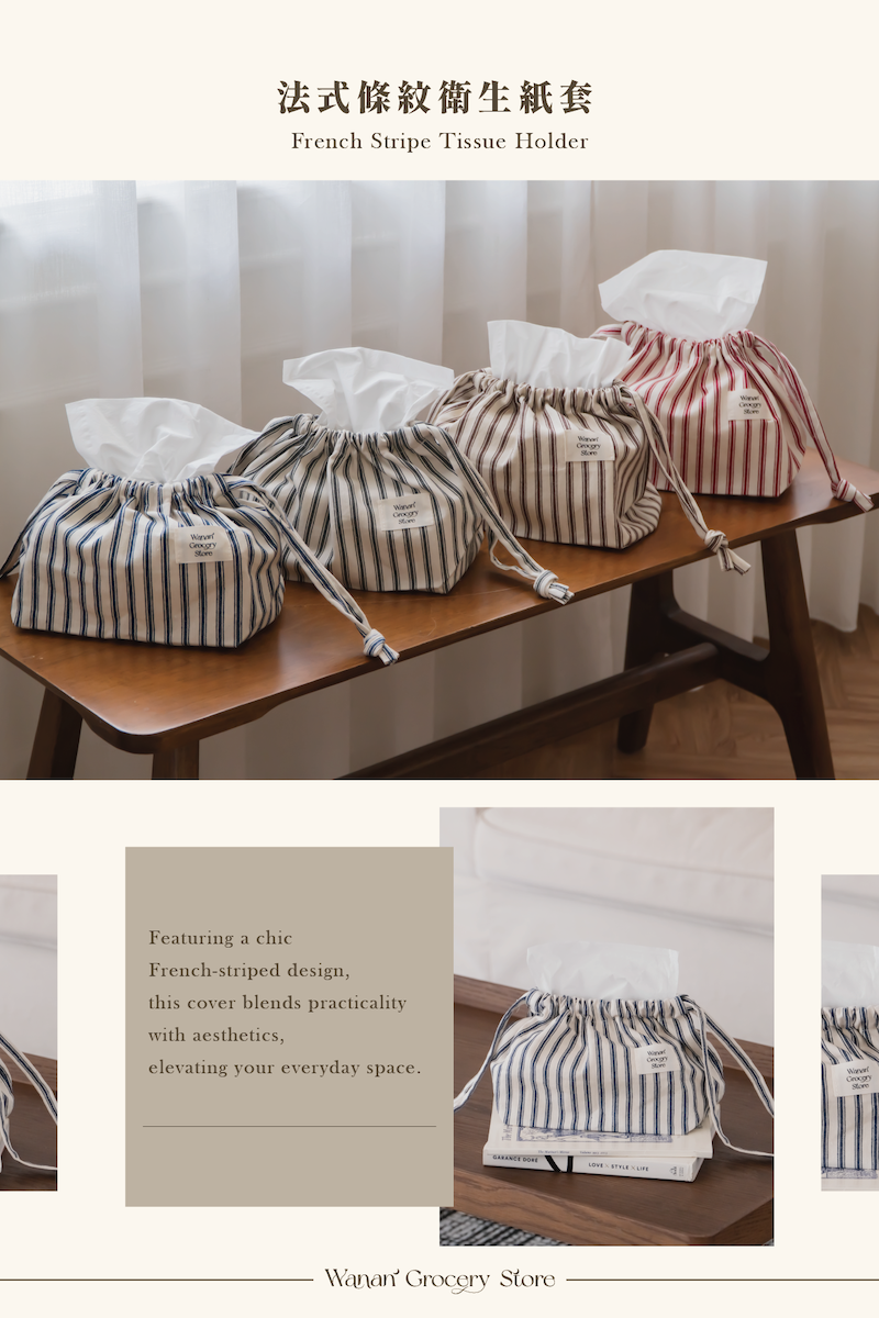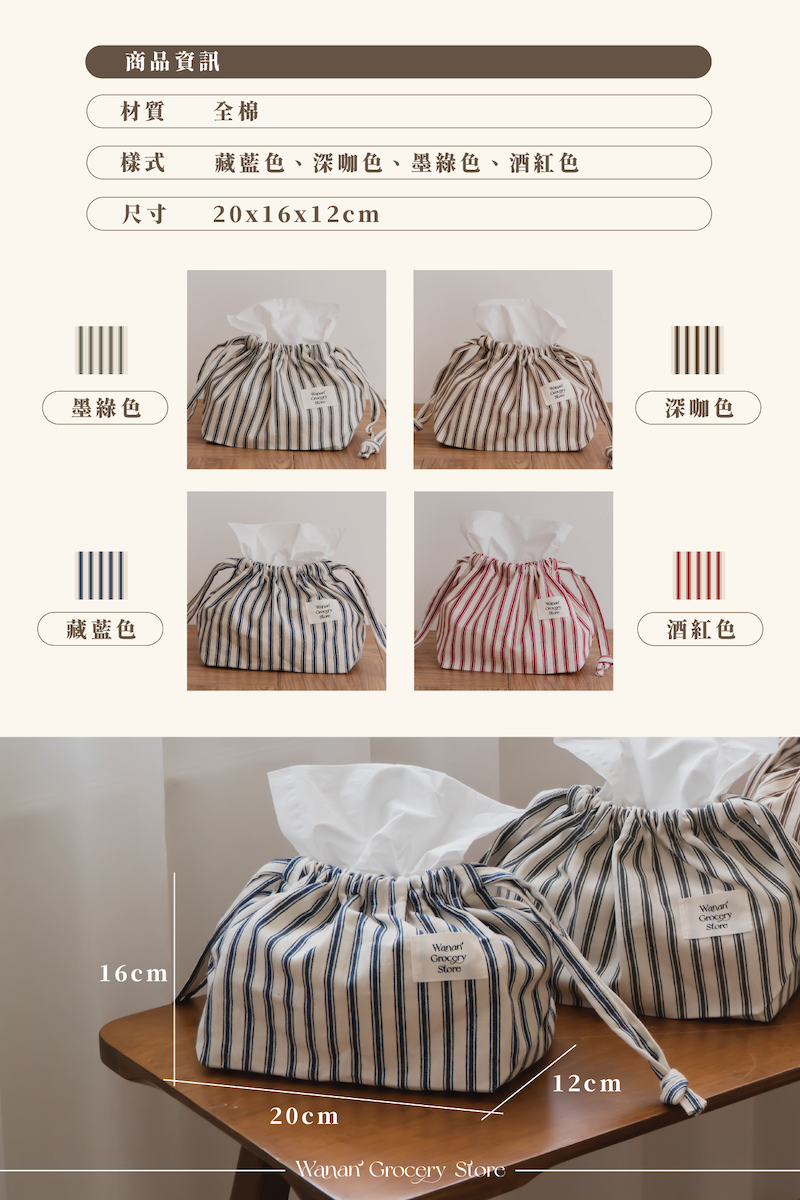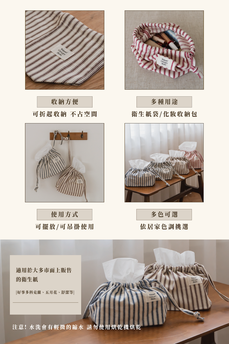 晚安你好再簡單的生活,也值得好好被收納。這款 Wanan 條紋束口袋,是我們為「小雜物也能好好收納」的念頭產生的。選用全棉材質與四種低飽和法式色條紋,讓它不只是衛生紙的外衣,也是空間裡一抹溫柔的裝飾。束口可調節設計,輕鬆收納市售 200 抽衛生紙(好市多尺寸 OK!)也可以收化妝品、耳機線、小型保養瓶、女性用品等,柔軟可折,拿來當外出包也無違和。你想收什麼,它就會幫你藏起什麼。而生活,也因此變得有條理又好看。⚠️下水後就無法退換貨!務必檢查過再讓他洗澎澎🛁