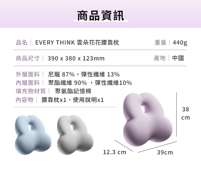 品名:EVERY THINK 雲朵花花腰靠枕尺寸:39x38x12.3 cm重量:440g材質:外層面料:尼龍87% / 彈性纖維13%內層面料:聚酯纖維 90%,彈性纖維10%填充物:聚氨酯記憶棉產品內容物:腰靠枕x1、使用說明x1