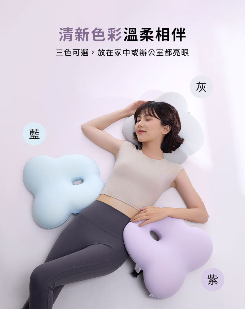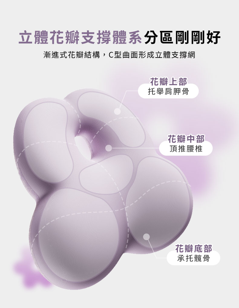 ◇花朵造型,中空透氣設計◇分區支撐 穩定舒適◇涼感面料 親膚不悶熱◇高彈綁帶 輕鬆固定◇可拆洗腰枕套