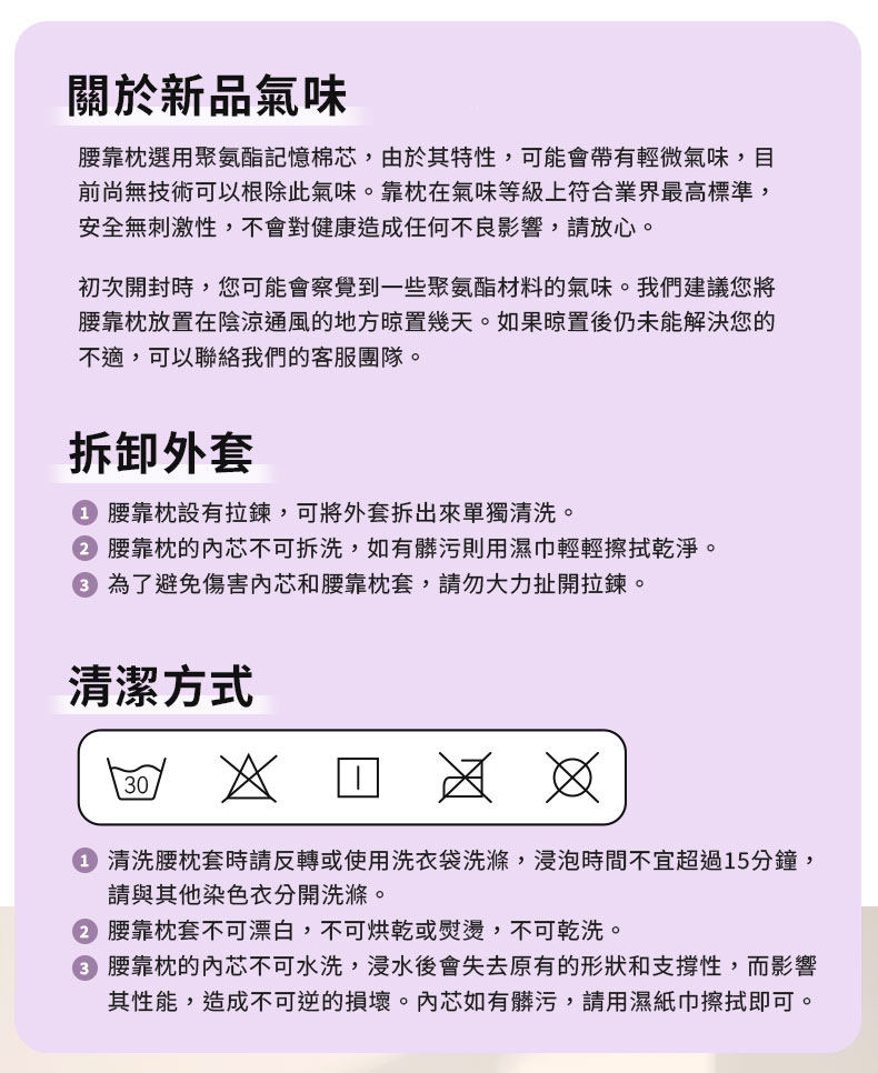 1. 清洗腰靠枕套時,請反轉或使用洗衣袋進行洗滌,浸泡時間不宜超過15分鐘,請與其他染色衣物分開洗滌。2. 不可漂白,不可烘乾或熨燙、不可乾洗。3. 內芯不可水洗,浸水後會失去原有的形狀和支撐性,而影響其性能,造成不可逆的損壞。內芯如有髒汙,請用濕紙巾擦拭即可。