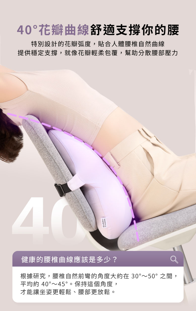 可愛花朵造型搭配中空透氣設計,讓久坐時依然保持舒爽不悶熱。分區支撐能精準貼合腰椎自然曲線,穩定承托並分散壓力,讓腰背獲得放鬆感受。選用親膚涼感面料,觸感柔和清涼,高彈力綁帶設計,能快速固定於椅背,不論辦公、閱讀或休憩都輕鬆使用。