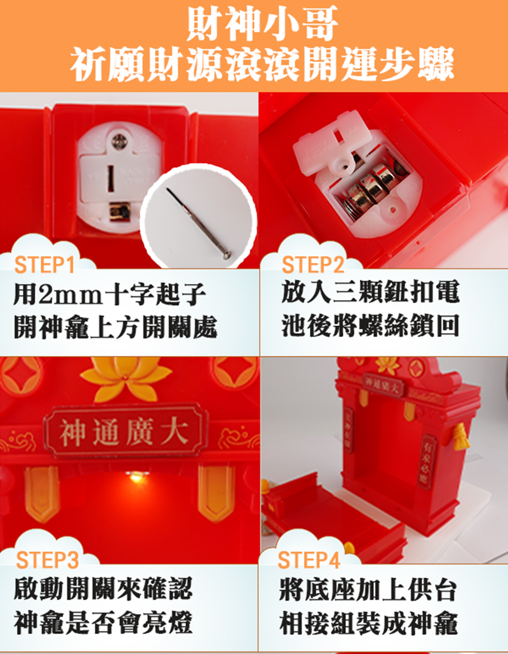 1. 用十字起子轉開開關放入三顆鈕扣電池點亮神龕