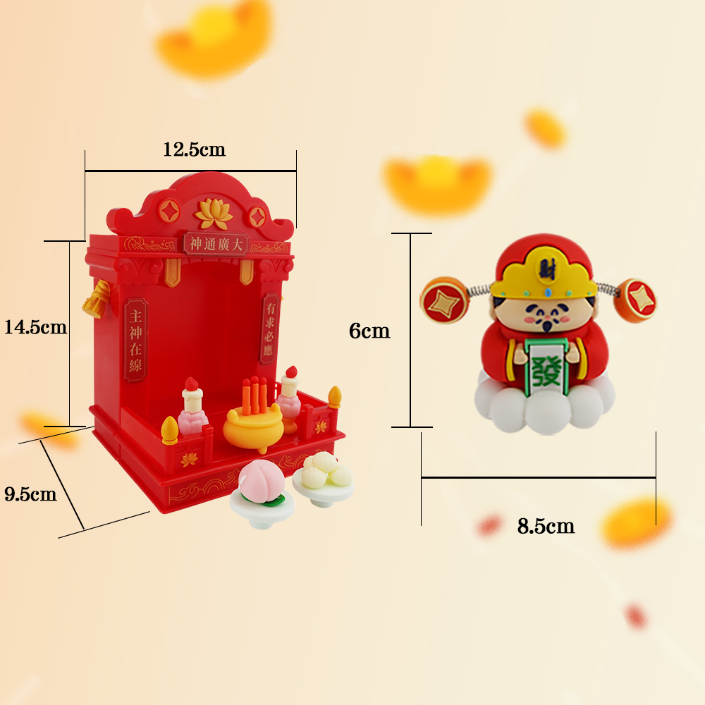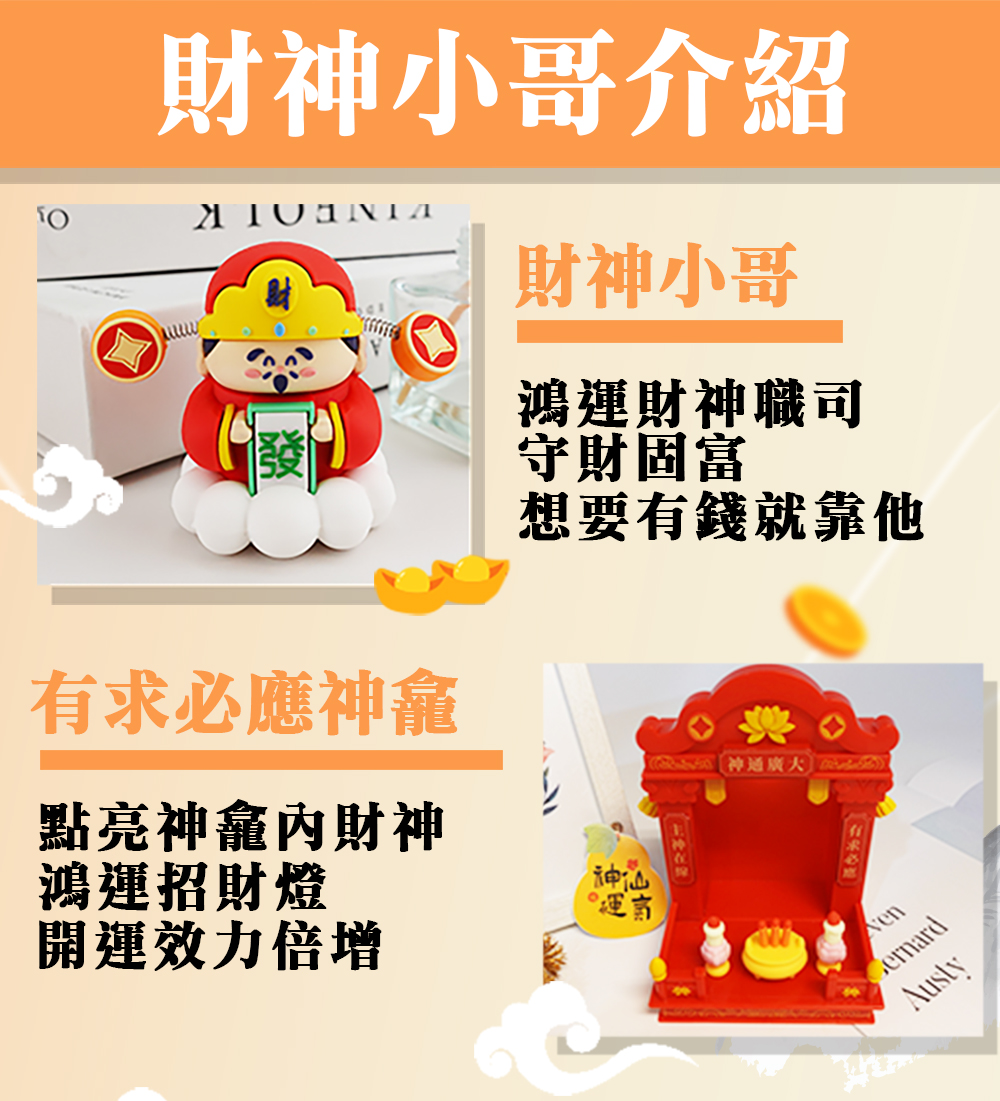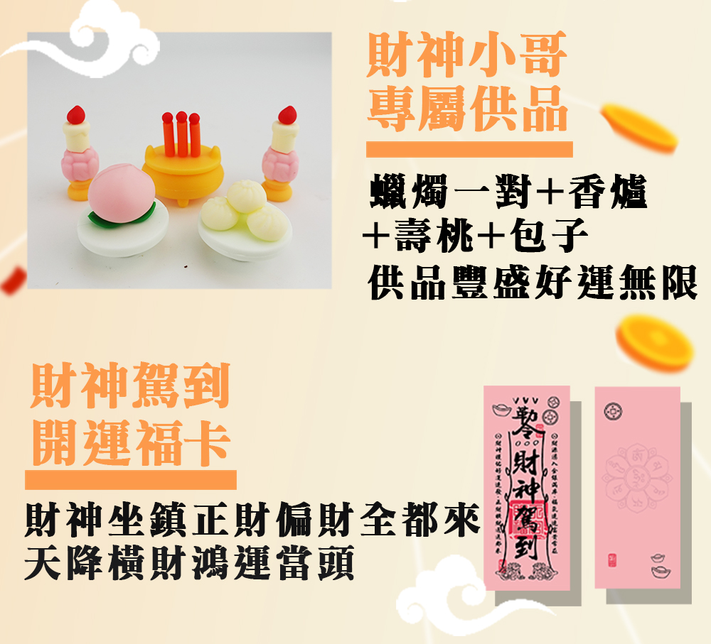 整組神龕貼心準備了 財神小哥的專屬供品──蠟燭、香爐、壽桃、包子,寓意「添壽添財、財源滾滾、聚福聚寶」。點亮神光=主神立刻上線,再搭配命運好好玩獨家的財神聚寶符卡,把生辰八字寫上去貼在背面,專屬財運加持瞬間 MAX!有財神小哥坐鎮,不論是求正財、偏財,還是想守住家中的財庫,都能為你添財添福、聚寶聚富,錢財運勢暢旺不停!