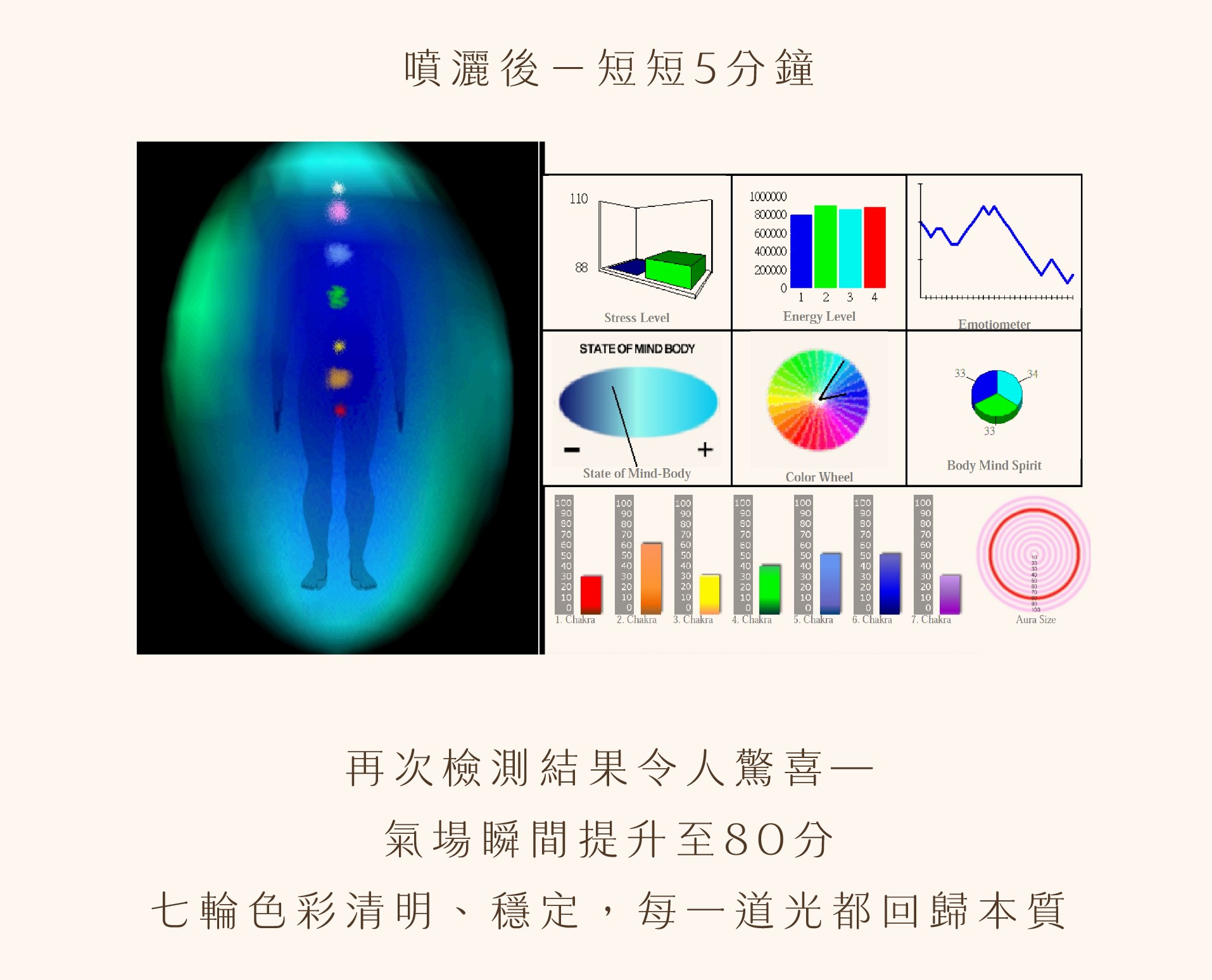 經AVS人體光譜儀實測,本噴霧可協助清理能量雜點,提升整體氣場頻率,讓七脈輪更清澈和諧
