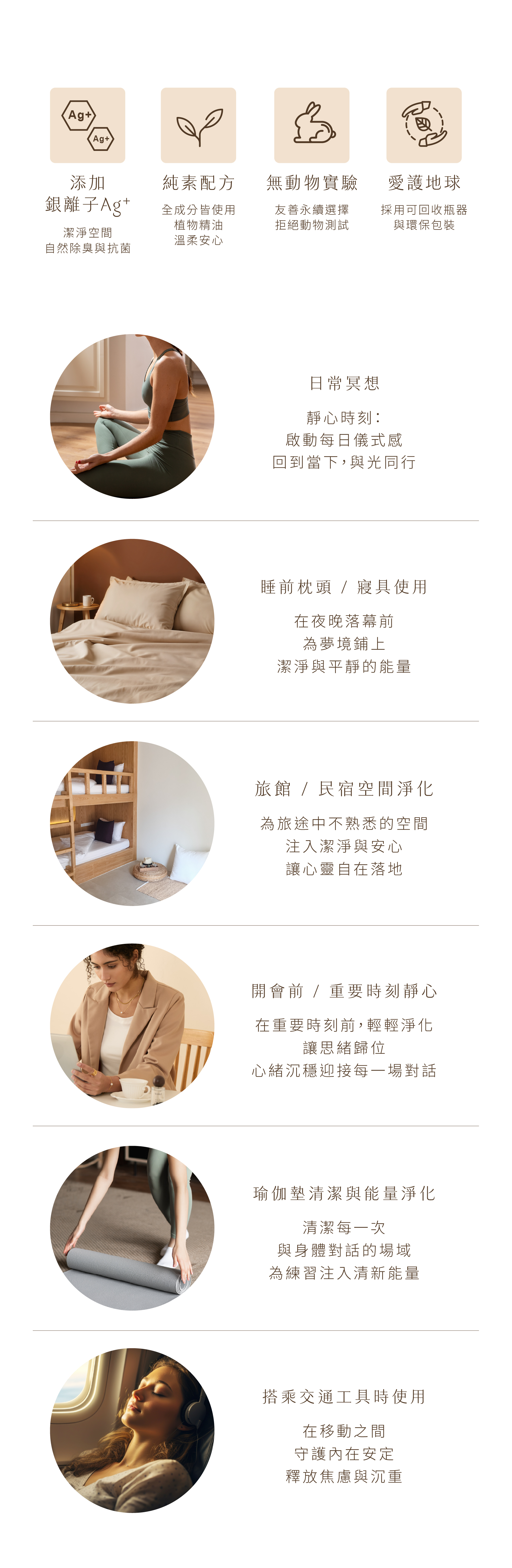天然精油搭配銀離子,氣味純淨,安全安心,適合日常、冥想、睡前放鬆或儀式療癒