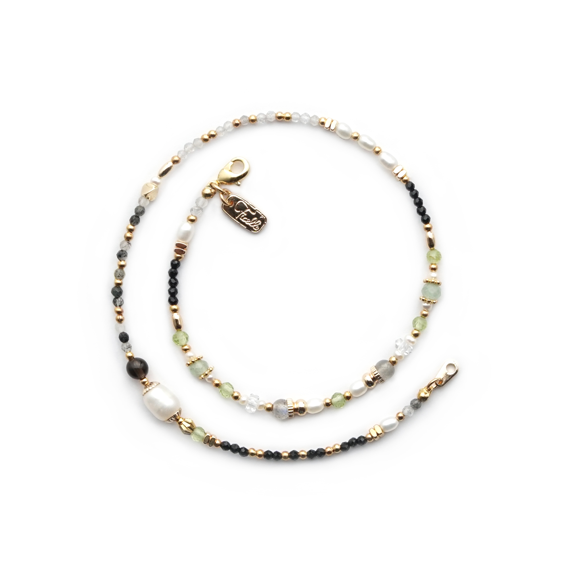 – 商品材質 Product Materials –淡水珍珠、茶晶、尖晶石、黑髮晶、拉長石、橄欖石、東陵玉、白水晶、黃銅鍍18K金