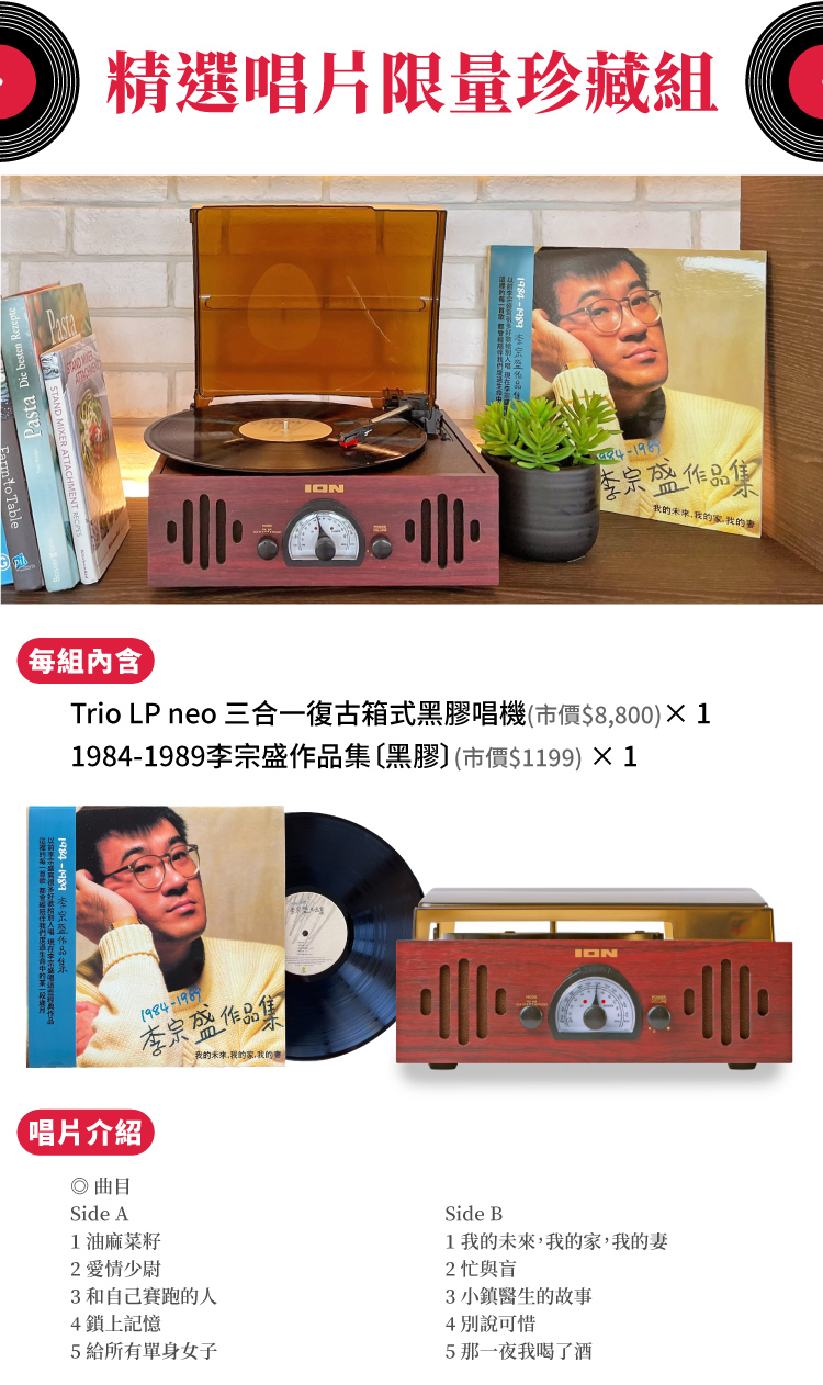 ✨ 「送他一份能聽見歲月故事的經典好禮」🎵 ION Audio Trio LP neo 3合1復古黑膠唱機,結合黑膠播放、AM/FM收音與立體聲喇叭,重現經典旋律。搭配 💿 李宗盛《1984–1989 作品集》限量黑膠,收錄黃金年代的動人創作,聲聲入心。木紋手提箱設計 × 復古音質,為居家增添文藝氣息。🎄 聖誕節、🎂 生日或 🏠 喬遷皆宜,這份禮物象徵品味與回憶,是送給摯友、父母或長輩的經典收藏。