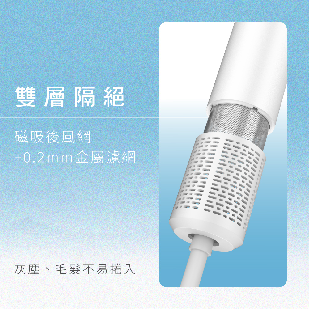 磁吸後風網+0.2mm金屬濾網,灰塵及頭髮不易吸入。