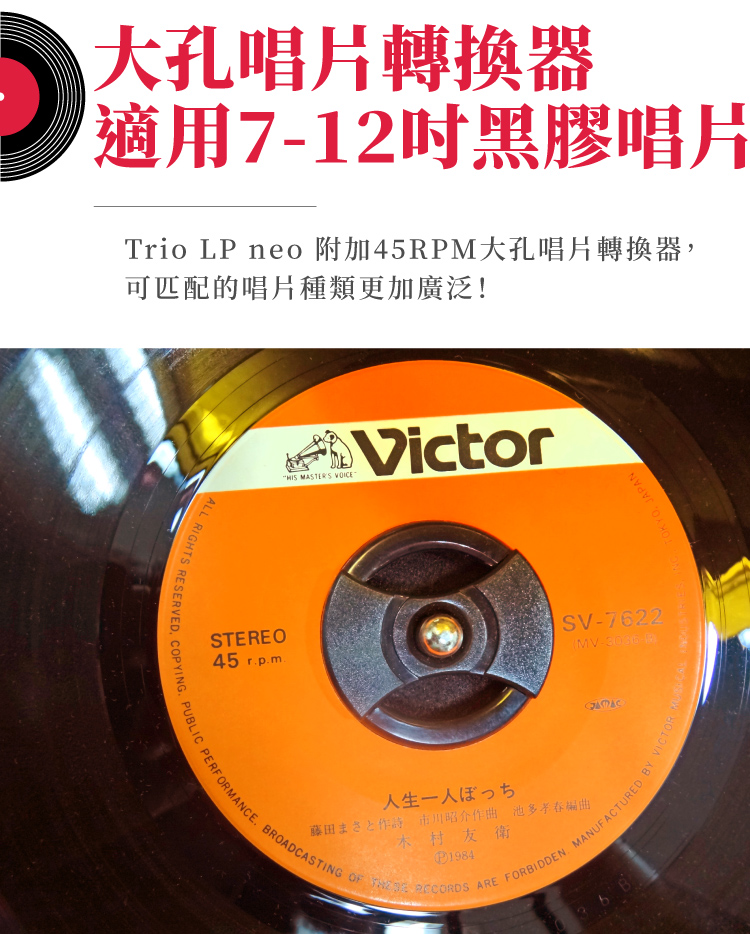 【產品規格】包裝內容:Trio LP neo*1、45 RPM轉換器*1、說明書*1、《愛黛兒 最愛精選集 黃膠 LP》*1材 質:木質、塑料商品尺寸:270 x 320 x 110mm (單位mm)重 量:2.26 kg電源輸入:100-120V~ 50/60Hz輸 出:RCA Output唱針類型:陶瓷唱針頭 :錐型,鑽石尖端產 地:中國