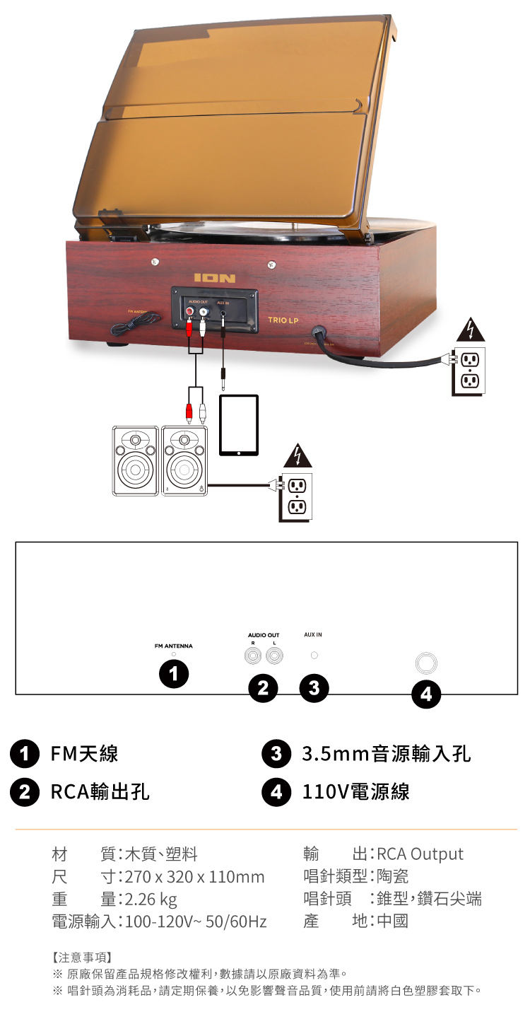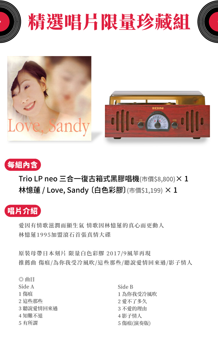 【注意事項】※ 本賣場為黑膠唱片組合賣場,黑膠唱片為影音商品,商品性質具備消保法第十九條所定之合理例外情事,拆封後不得於七日內不附理由解除契約,如欲退貨請勿拆封。※ 唱針頭為消耗品,請定期保養,以免影響聲音品質,使用前請將白色塑膠套取下。※ 原廠保留產品規格修改權利,數據請以原廠資料為準。※ 產品示意圖僅供參考,本賣場不包含主商品以外之示意配件,如:黑膠唱片。※ 本賣場產品圖片,可能會因為拍攝角度、環境、螢幕設定、燈光明暗等因素,而產生色差,故請以實際收到貨品為準。※ 產品規格之尺寸、重量,皆為人工測量,測量可能會有些許差距(尺寸誤差±2cm/重量誤差±10%g內皆屬正常範圍)原廠保留產品規格修改權利,數據請以原廠資料為準。