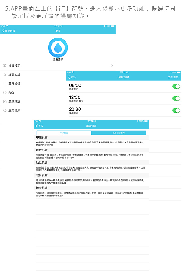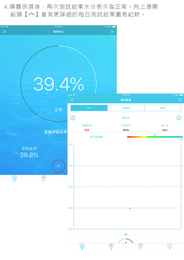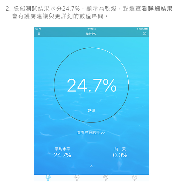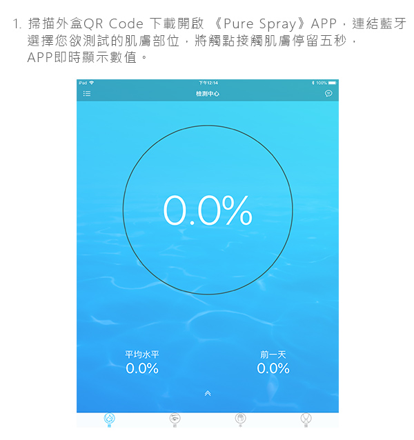 ◆ 奈米級細緻噴霧 深層補水◆ 藍牙4.0一鍵連結專屬APP操作 ◆ 接觸肌膚輕壓五秒 APP即時顯示偵測結果 ◆ 區分紀錄臉部、手部、頸部、眼部 ◆ MicroUSB充電 輕巧隨身攜帶