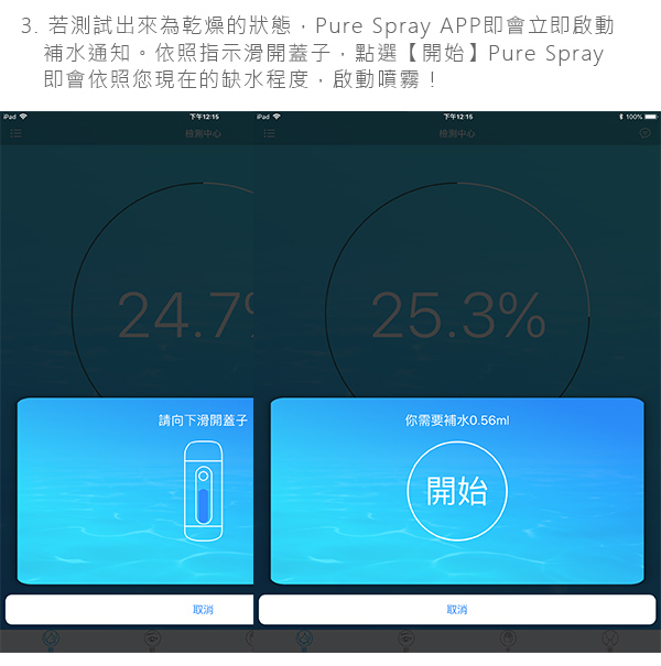 【產品規格】包裝內容物:Pure Spray 肌膚水分偵測保濕噴霧器*1、產品說明書*1、Micro USB充電線*1、補水瓶*1、清潔刷頭*1、隨身收納袋*1材 質 :PC、PE、PP、合金重 量 :85g容 量 :12ml商品尺寸 :125 x 45 x 20mm藍牙版本 :藍牙4.0 適用型號 :Android 版本 4.3 以上、 iOS 8.0 或以上版本之 iPhone、iPad 及 iPod touch。(APP版本更新請以原廠為準) 電池容量 :600mAh 3.7V ※當電量低於5%時,LED燈光會開始閃爍。充電方式 :Micro USB充電時間 :1.0h使用時間 :2.5h產 地 :中國