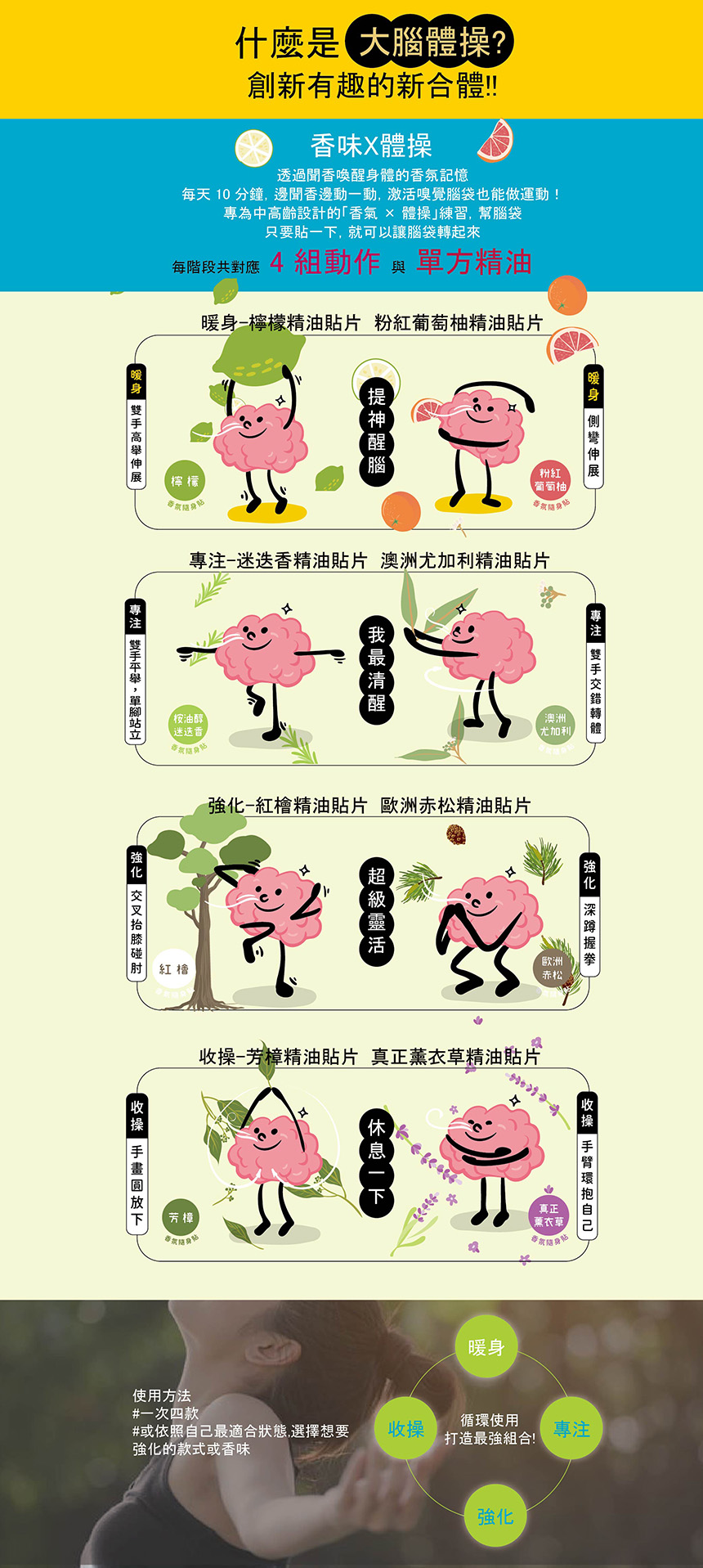 每個階段都有專屬的精油香氣+簡單動作,香味也可以跟腦袋共鳴,激活最深處的記憶力。