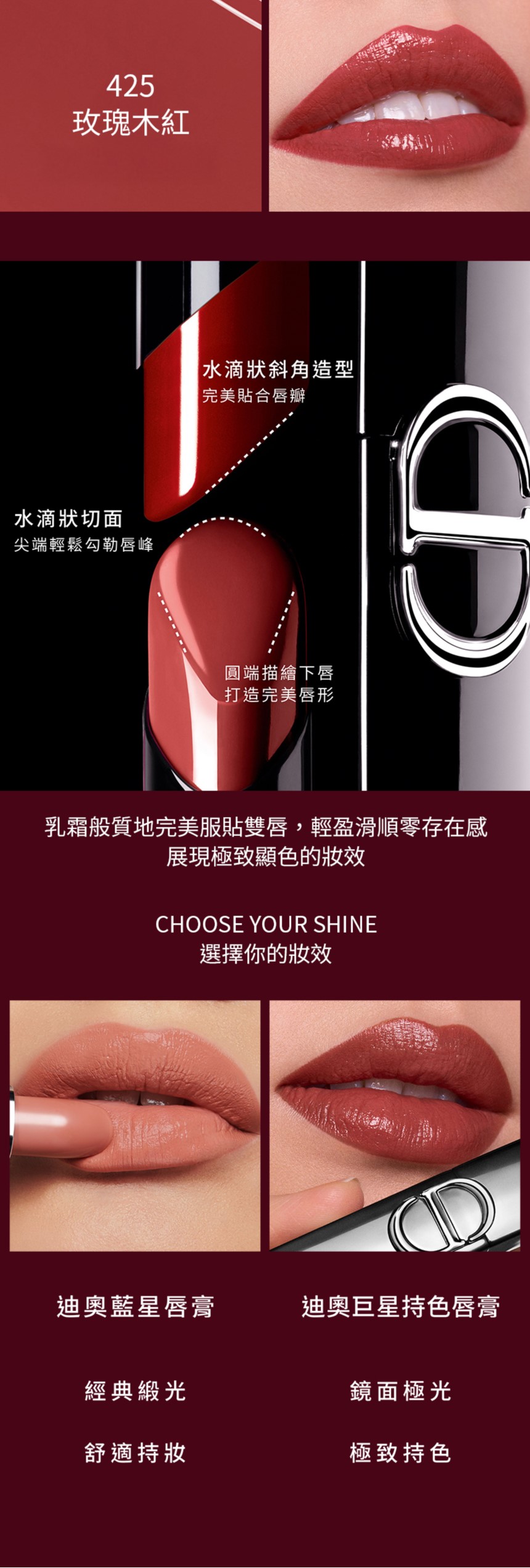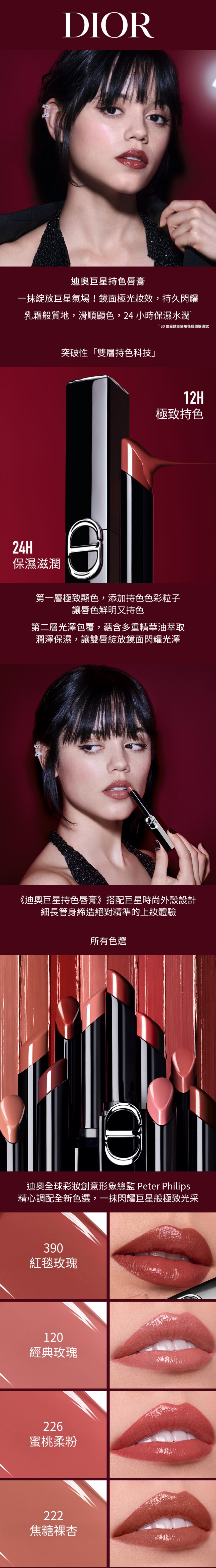 《迪奧巨星持色唇膏》一抹綻放巨星氣場!鏡面極光妝效,持久閃耀。配方含紅牡丹花萃帶來保濕豐潤功效,石榴花萃可柔嫩緊實唇瓣。乳霜般質地,滑順顯色,帶來極致舒適的上妝感受。24小時保濕滋潤¹ ,展現零妥協的持妝力。《迪奧巨星持色唇膏》搭配巨星時尚外殼設計,細長管身締造絕對精準的上妝體驗。水滴狀斜角造型完美貼合唇瓣,如唇線筆般輕鬆勾勒唇形,同時帶來豐盈飽滿妝效,一抹打造巨星雙唇。¹ 30位受試者使用後經儀器測試。