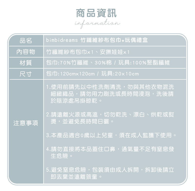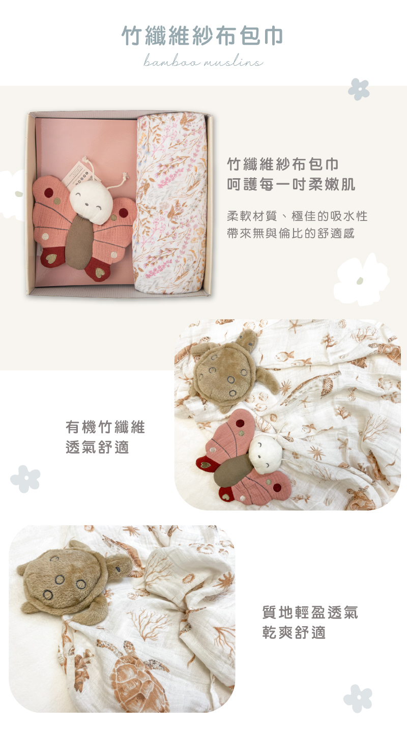 ■ 商品說明:送出一個富含趣味及實用性的禮物吧。"BBD竹纖維紗布巾+玩偶",輕柔親膚的竹纖維紗布包巾,配上與包巾圖案相呼應的可愛絨毛玩偶,再加上精美的禮盒包裝,作為做給新手爸媽的新生兒禮物,在適合不過了。