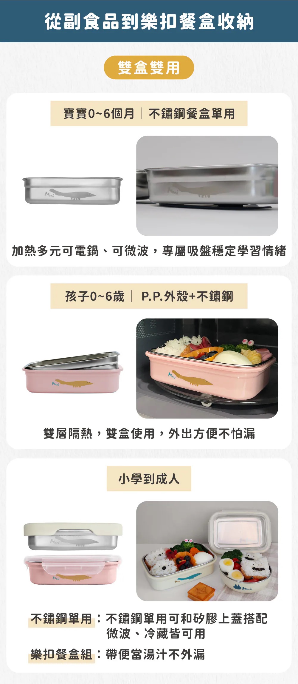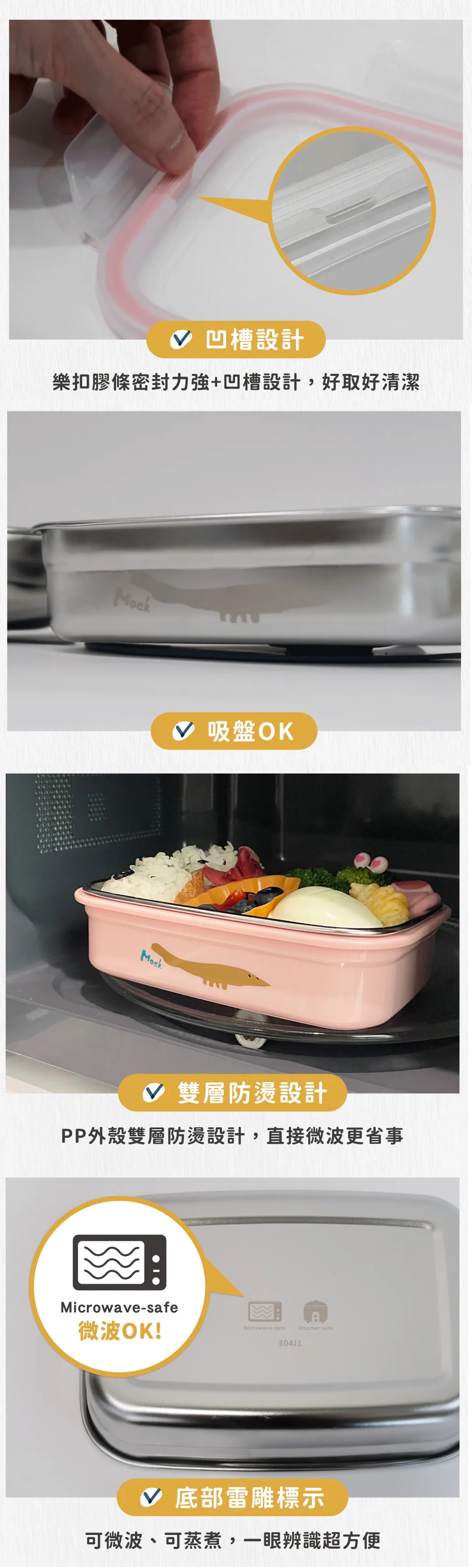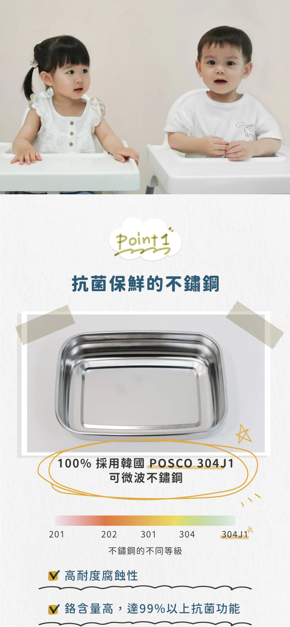 商品特色:100%採用韓國 POSCO 304J1可微波不鏽鋼抗菌材質外層防燙無毒PP雙層使用不鏽鋼電解式工藝-無黑油、無研磨劑 【不需要繁瑣的去黑油清潔,一般清潔就能安心使用】內容物包括:不鏽鋼餐盒、PP外殼、矽膠分隔上蓋、樂扣上蓋韓國製造Made in Korea