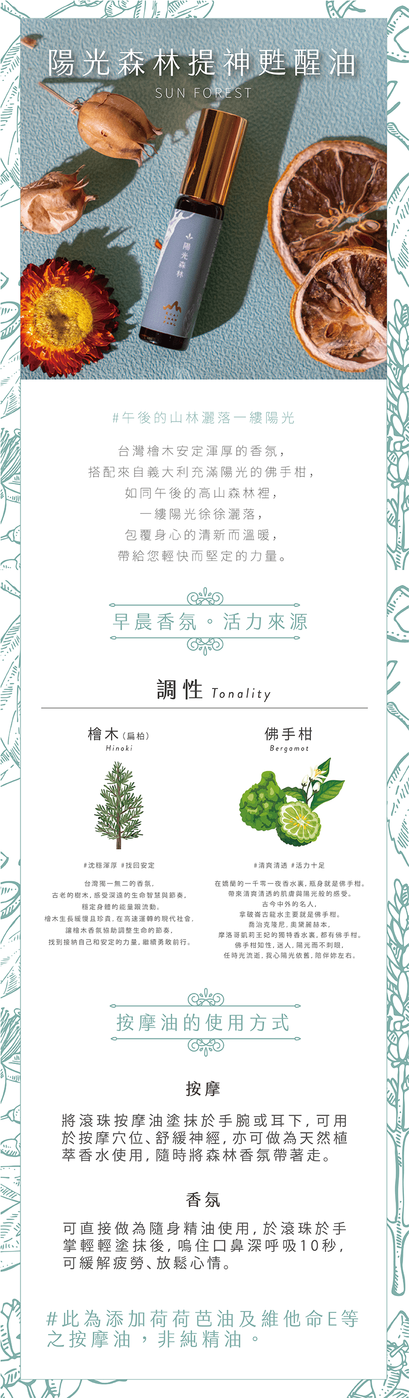 陽光森林(佛手柑 + 檜木)清新柑橘與檜木交織,彷彿漫步林間的陽光。