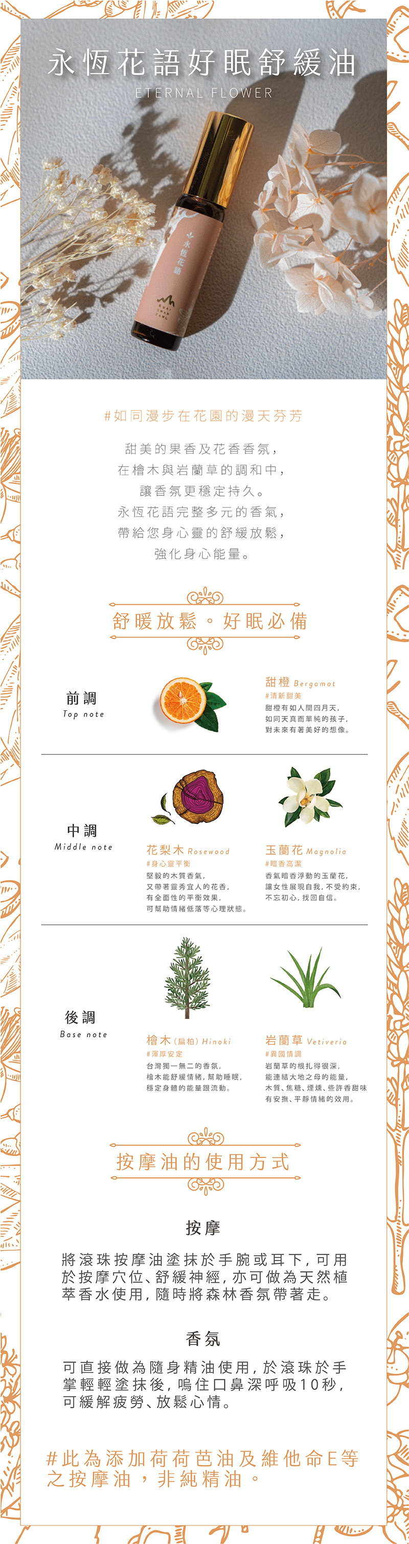 永恆花語👉 前調:甜橙、佛手柑👉 中調:玉蘭花、花梨木👉 後調:檜木、岩蘭草層次優雅,花木交融,展現細膩浪漫。