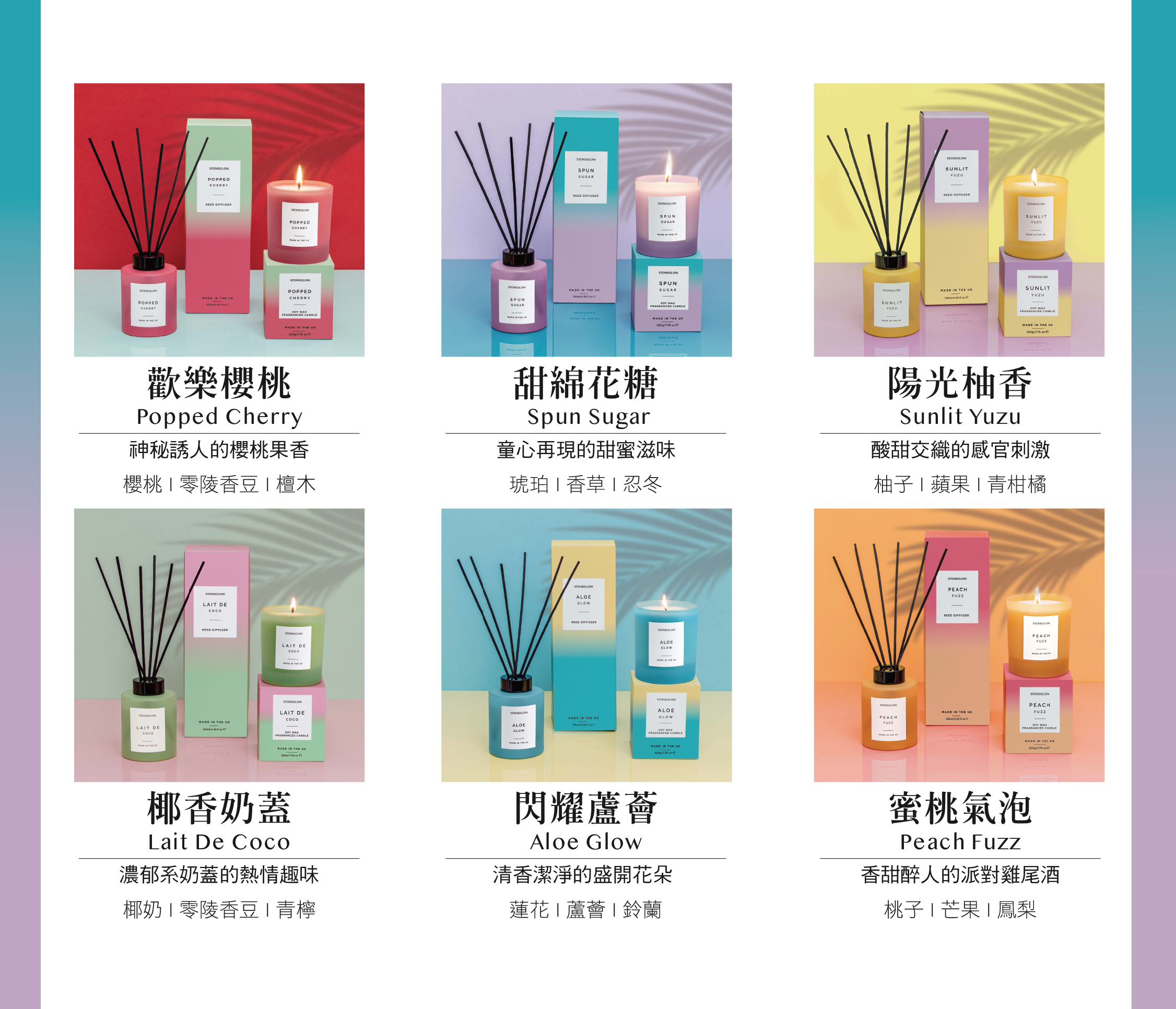 - 歡樂櫻桃 Popped Cherry:酸甜交織的果香,派對感十足- 甜綿花糖 Spun Sugar:柔美甜香,像是嘉年華裡的粉紅棉花糖- 陽光柚香 Sunlit Yuzu:清爽柚香,充滿朝氣- 椰香奶蓋 Lait De Coco:奶香與椰子結合,溫潤療癒- 閃耀蘆薈 Aloe Glow:植萃綠意,清新純粹- 蜜桃氣泡 Peach Fuzz:蜜桃果香氣泡感,俏皮甜美