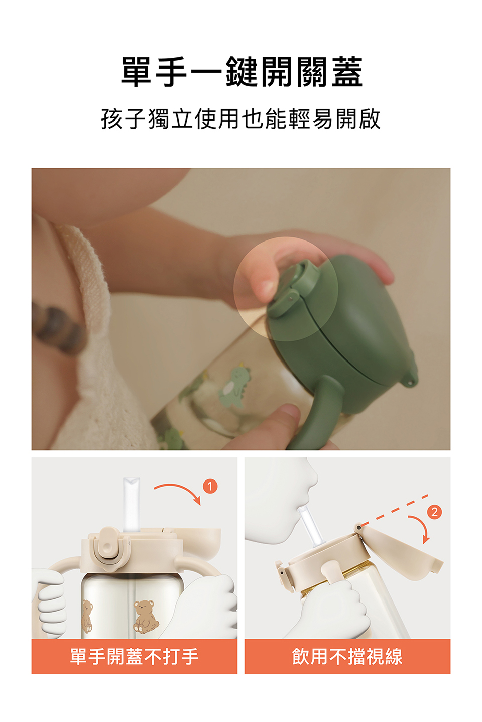 使用方式:扣環向下即解鎖,按壓彈蓋按鍵開啟上蓋,雙手握住把手以吸嘴吸飲,飲用後請將扣環向上鎖定。請搭配軟質刷具清洗並置於陰涼乾燥處存放。