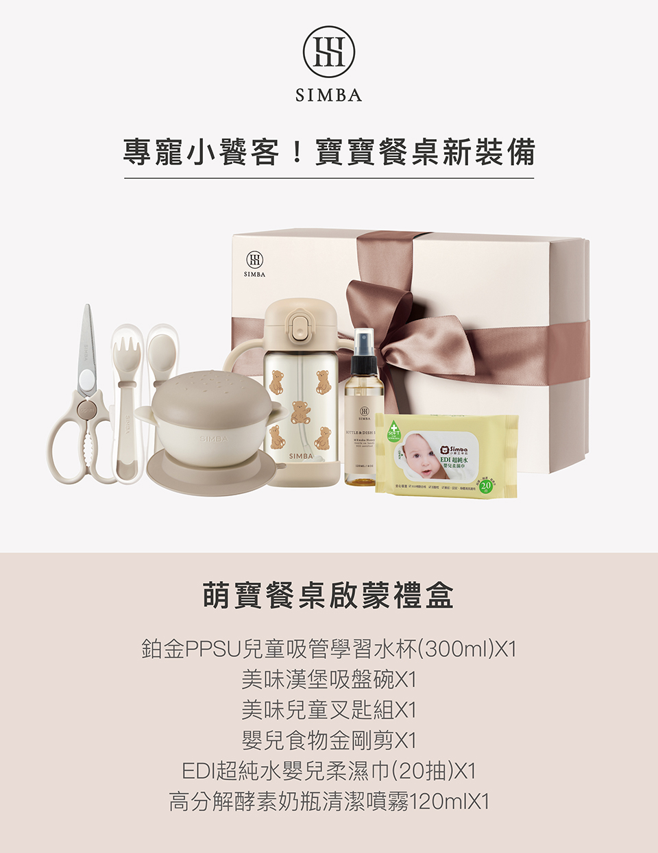 內容物:鉑金PPSU兒童吸管學習水杯300mlX1+美味漢堡吸盤碗X1+美味兒童叉匙組X1+嬰兒食物金剛剪X1+EDI超純水嬰兒柔濕巾(20抽)X1+高分解酵素奶瓶清潔噴霧120mlX1