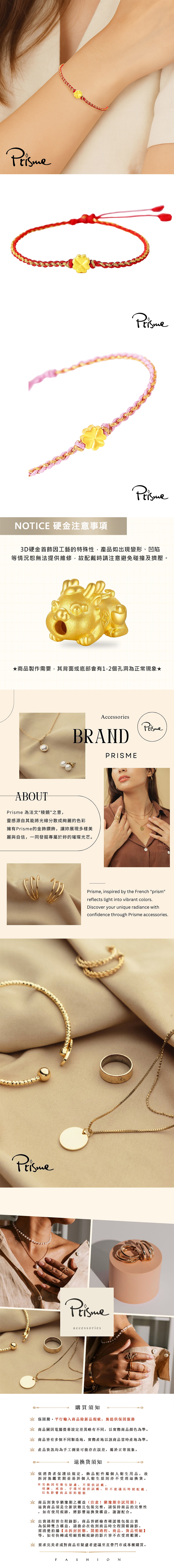 ◆商品內容品牌 Prisme Gold重量 金重:約0.02錢±0.01材質說明 墜飾:999純金|手鍊:繩編織商品尺寸 墜飾:寬約0.6cm|鍊長:約16cm商品包裝配件 手鍊、保證書、精美禮盒
