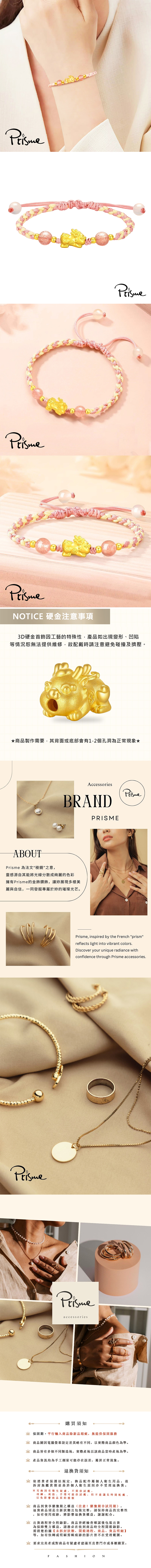 品牌 Prisme Gold款式 手鍊重量 金重:約0.07錢±0.03材質說明 墜飾:999純金|鍊子:繩編織商品尺寸 墜飾:寬約1.1cm|鍊長:約17-24cm(可調整)商品包裝配件 手鍊、保證書、精美禮盒