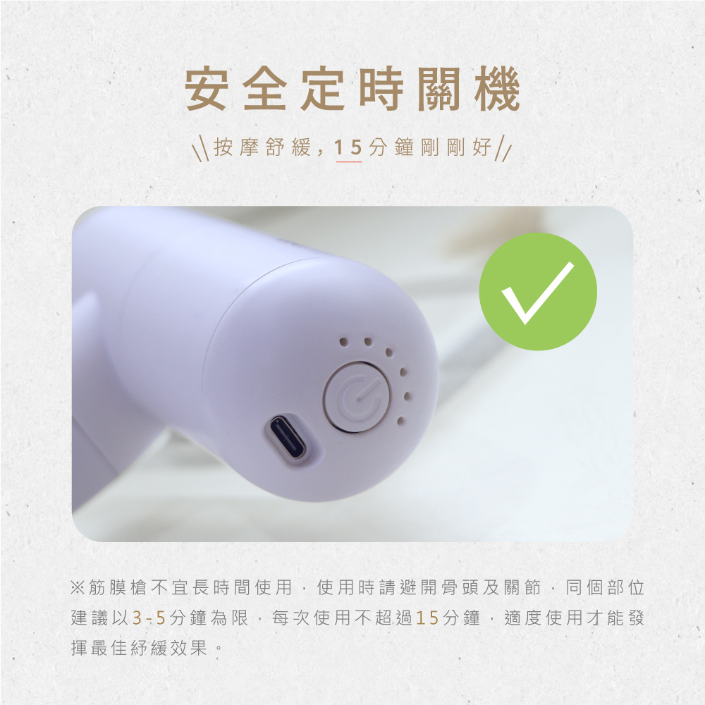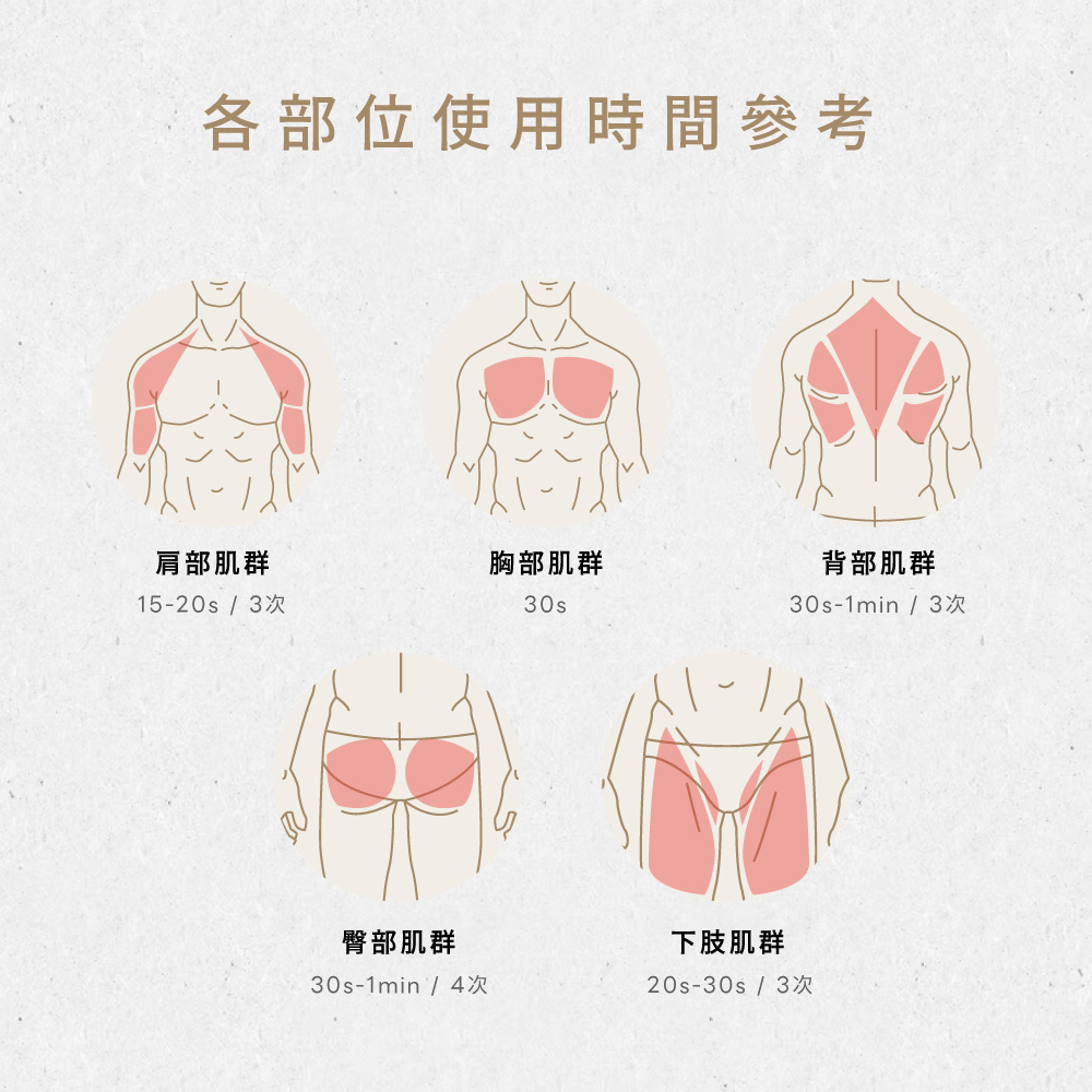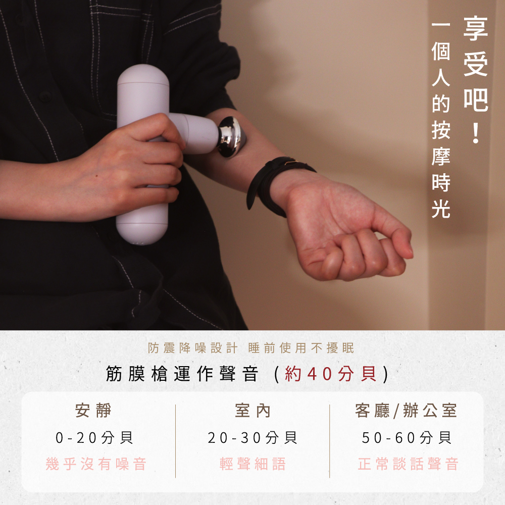 .單鍵開關 極簡操作,一鍵掌握所有功能.六段檔位 依據身體感受度,調節最適力度 輕度按摩(1-2檔)→筋膜放鬆(3-4檔)→深層舒緩(5-6檔).八款專業按摩頭 各肌群按摩/強化/舒緩/雕塑 精準搭配.安全電路設計 充電即停止運行,安全防護使用更安心.40dB低噪音運轉 低分貝震動,靜音享受舒適.迷你x無線 僅400g! 輕巧便攜、無線使用