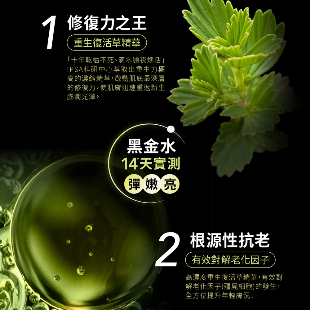 .第一支修護抗老精華水,日本奢選修復力之王「南非極境重生復活草」,有效修復肌底全面新生,一次根源性抗老,改善5大老化問題.添加Amino-5-in + 雙重活性植萃,使膠原工廠快充滿滿膠原,肌膚迅速彈嫩亮。.黑金水無添加酒精香精、Paraben類防腐劑,超滲透秒速吸收,14天肌膚彈嫩亮