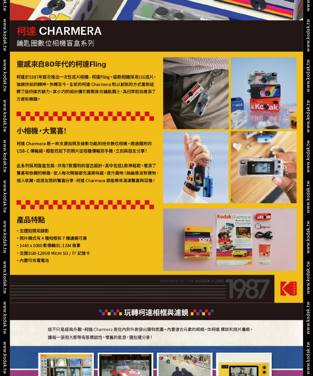 • 影像感測器:1⁄4 吋 CMOS • 鏡頭:35mm;f/2.5 • 接口:USB-C • 儲存:Micro SD (1GB-128GB) • 影像輸出:1440 x 1080 ; 1.6M 像素 • 影像格式:JPEG • 幀率:30 fps • 影片格式:AVI • 電池:可充電 200mAH • 年齡限制:15歲以上 • 尺寸:58 (寬) x 24.5 (高) x 20 (深) mm • 重量:30g • 材料:ABS
