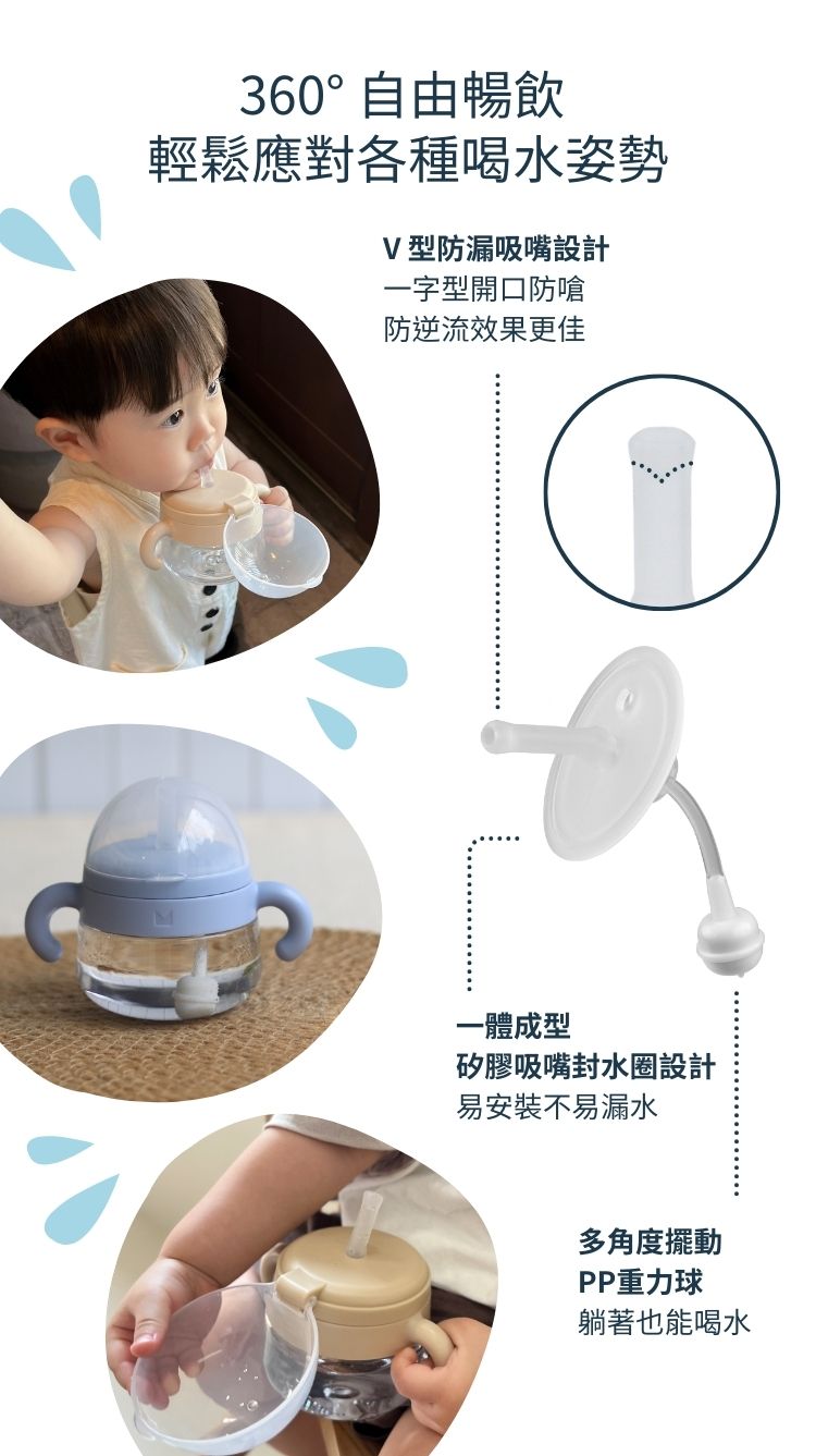 商品特色:◆V型防漏吸嘴設計,一字型開口,倒置防漏水,慢流速防嗆水◆矽膠吸管底部重力球設計,寶寶斜躺著也能飲水◆無重金屬風險◆不含雙酚A、甲醛、酚類◆洗碗機適用,請勿放入微波爐使用