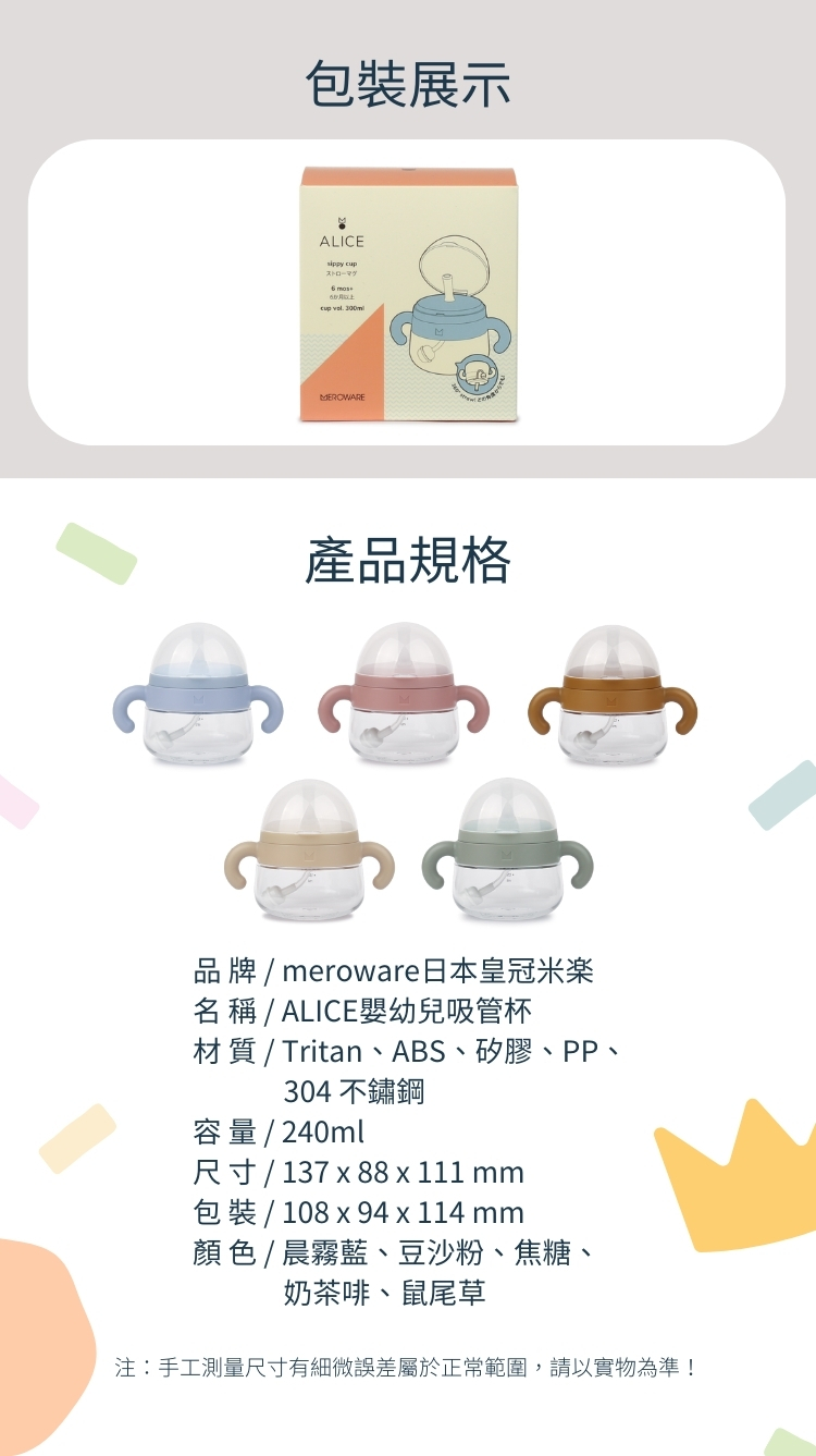 【溫馨提醒】・吸管建議每2-3個月更換一次。・第一次使用前請先將各部件拆開徹底清洗,並請詳細閱讀本產品使用說明書。.建議裝入40度左右適宜寶寶飲用的飲品。.確保隨時在成人的監護下給寶寶使用本產品。.避免使用紫外線消毒,以免產品及配件老化脆裂。・不同的品牌螢幕以及解析度不同,若網頁圖片顏色與實品呈現略有不同,請以實品顏色為準。・吸嘴為十字切口設計,咬合吸水。這樣的設計可減少寶寶脹氣、嗆水等情況。一些寶寶在適應階段可能有出水量少的情況,請媽媽們耐心指導。這並非品質問題