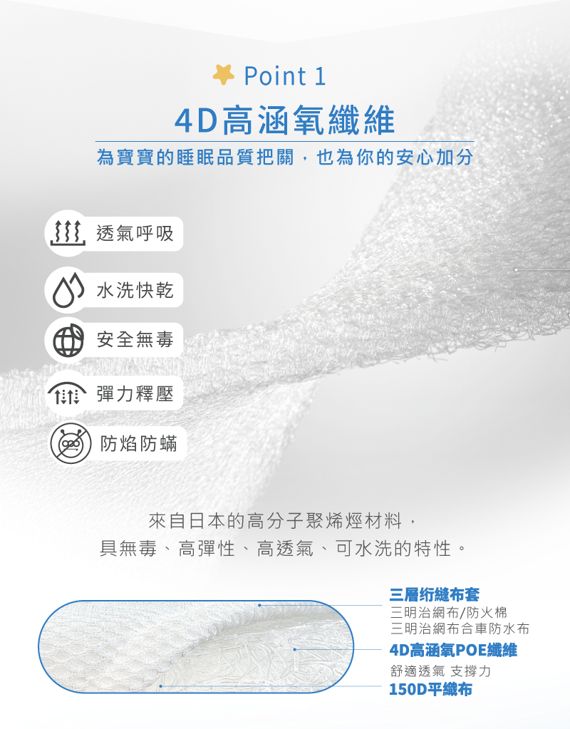 ■ 商品說明:透氣呼吸:4D高涵氧POE纖維結構,強化透氣循環,長效涼爽彈力釋壓:80,000次測試後仍保持95%高度,穩定舒適安全無毒:選用日本安全環保無毒材料,無塑化劑、螢光劑、游離甲醛防焰防螨:具防焰、防螨功能,全方位提升安全與防護性水洗速乾:墊體可水洗,布套可機洗,清潔便利,常保潔淨