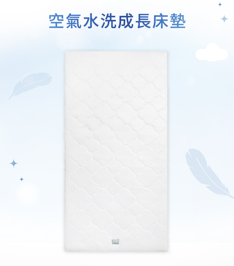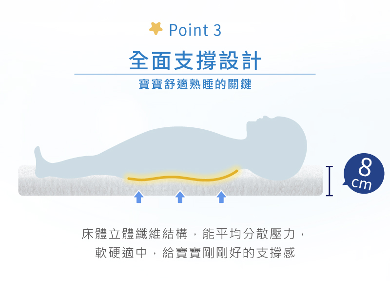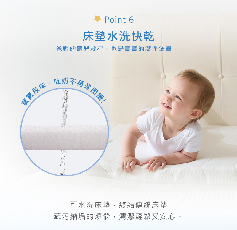 ◎全面支撐,一體成型8cm高度支撐設計◎成長設計,雙硬度結構可依寶寶成長換面使用◎防焰防螨,具物理防螨特性,隔絕髒污保護床墊◎透氣散熱,3D空氣纖維內墊,透氣循環不悶熱◎水洗快乾,整件可水洗,布套與床墊分別清洗◎安心入眠,製程不加任何膠或化學藥劑,使用安心