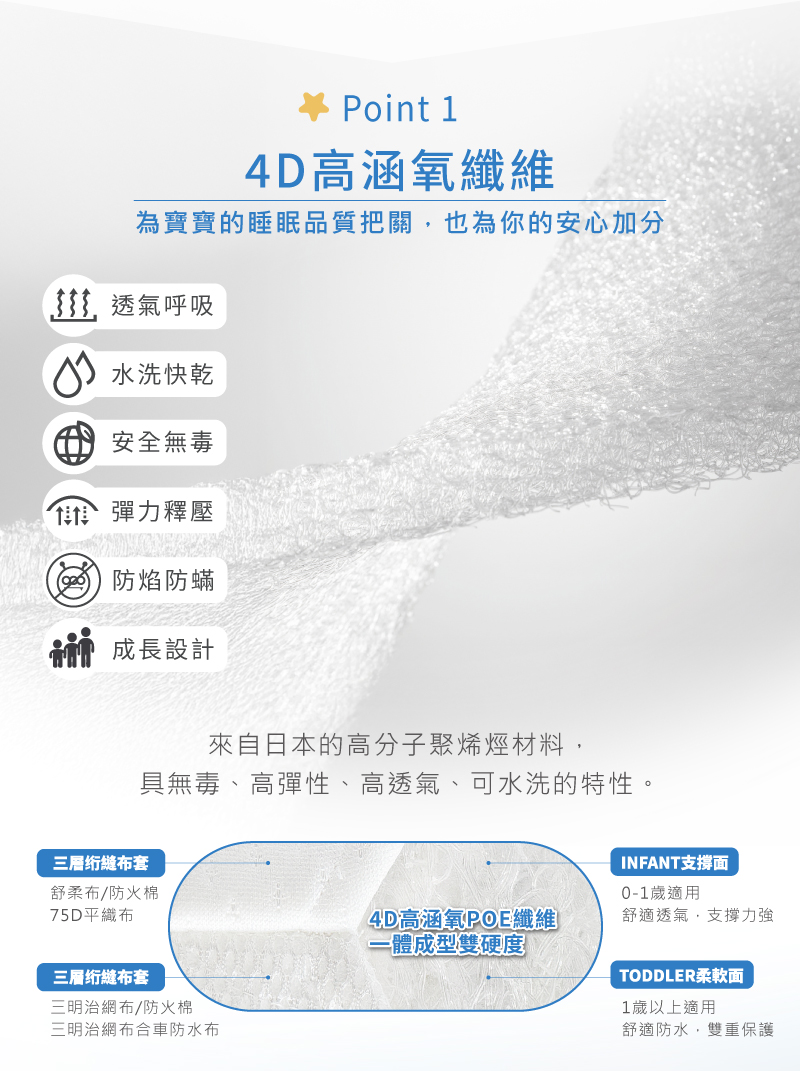 ■ 商品說明:成長設計:布套與墊體雙面結構設計,可隨成長階段調整使用透氣呼吸:4D高涵氧POE纖維結構,強化透氣性,保持涼爽舒適彈力釋壓:經80,000次下壓測試,保持95%高度,穩定舒適安全無毒:選用日本安全環保無毒材料,無塑化劑、螢光劑、游離甲醛防焰防螨:具防焰、防螨、防水功能,全方位提升安全與防護性水洗速乾:墊體可水洗,布套可機洗,清潔便利,常保潔淨
