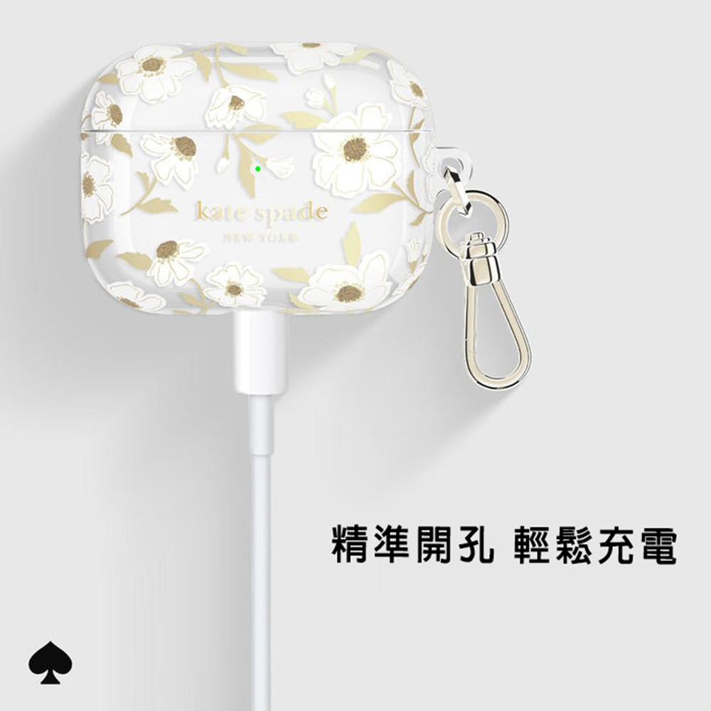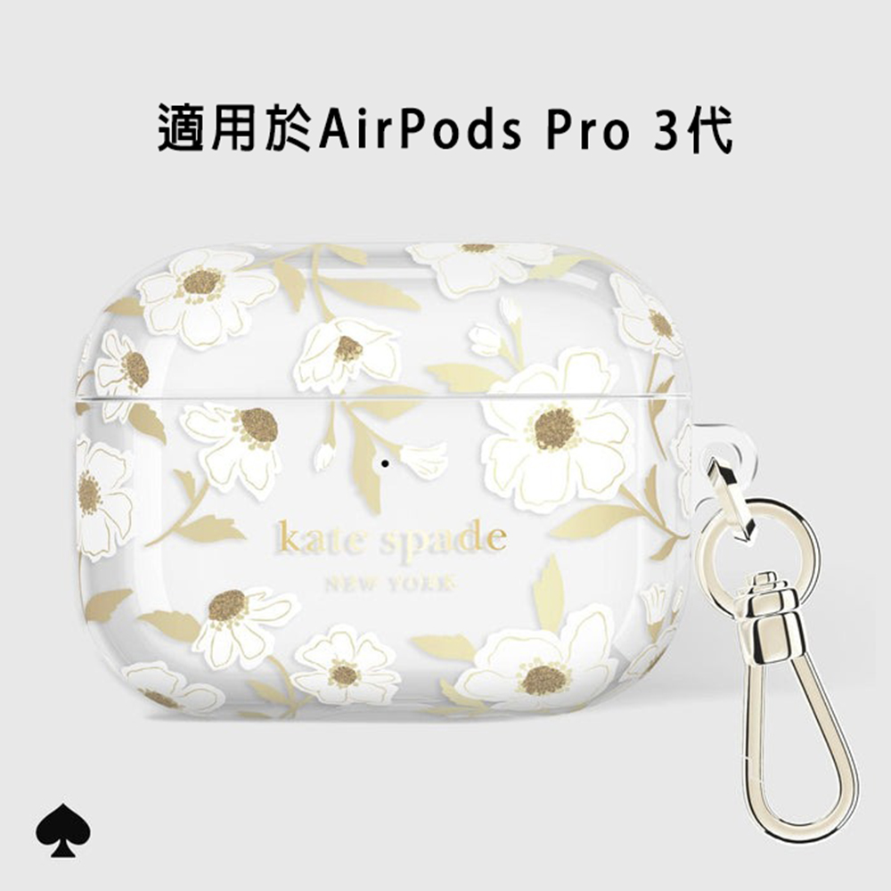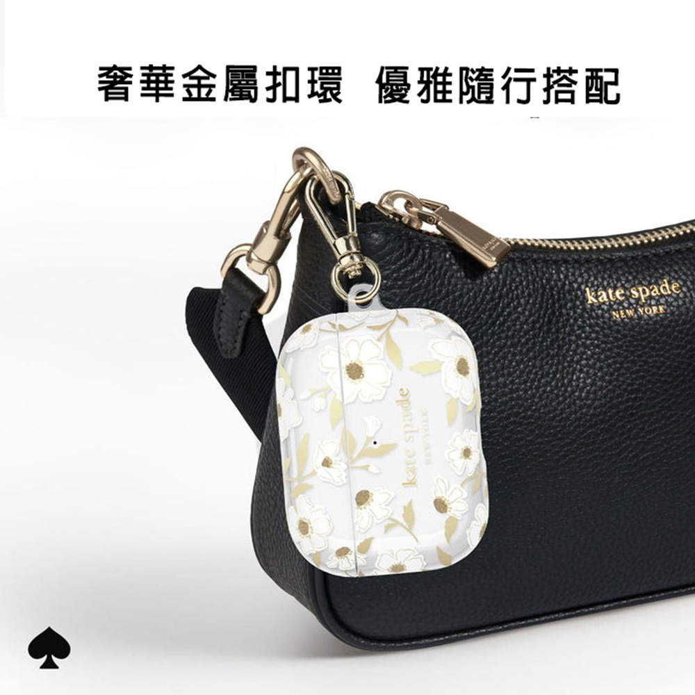 【商品特色介紹】🌸 優雅花卉|經典白底襯托淡雅茉莉花,純淨柔美、氣質出眾🌸 精品質感|來自紐約時尚品牌 kate spade,展現專屬高級氛圍🌸 貼合防護|貼合防護|精準開孔設計,完整守護 AirPods Pro 3,防刮耐用更安心🌸 隨身便利|附金屬掛勾,輕鬆固定於包包或鑰匙圈,外出安心又優雅【商品敘述】讓日常生活多一份清新,以白色基底點綴淡金色茉莉花卉,低調中展現高雅品味。嚴選材質耐用抗刮,貼合精準,並支援無線充電功能。附上金屬掛勾,無論通勤、約會或出遊,都能輕鬆隨身攜帶,展現紐約精品的獨特魅力。