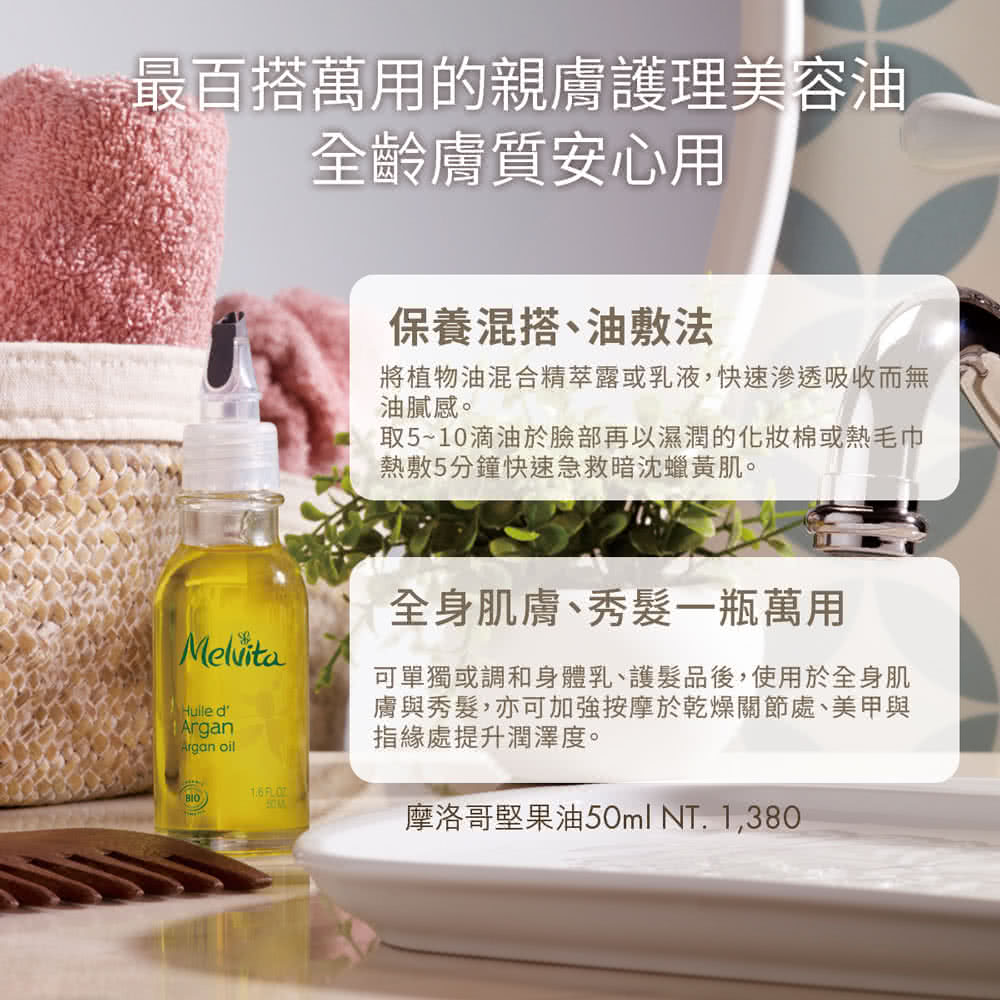 摩洛哥堅果油 - 內含豐富的脂肪酸,具有絕佳的水合保濕功效,能增加肌膚彈性,幫助恢復膚質彈性與柔嫩緊實。少見的植物固醇,能柔軟與緩和肌膚不適,防止肌膚老化並活化肌膚。→建議使用方法:可單獨使用,或於乳液及乳霜前使用於臉部與頸部肌膚,稍加按摩至吸收。亦可用於修護指甲與頭髮。