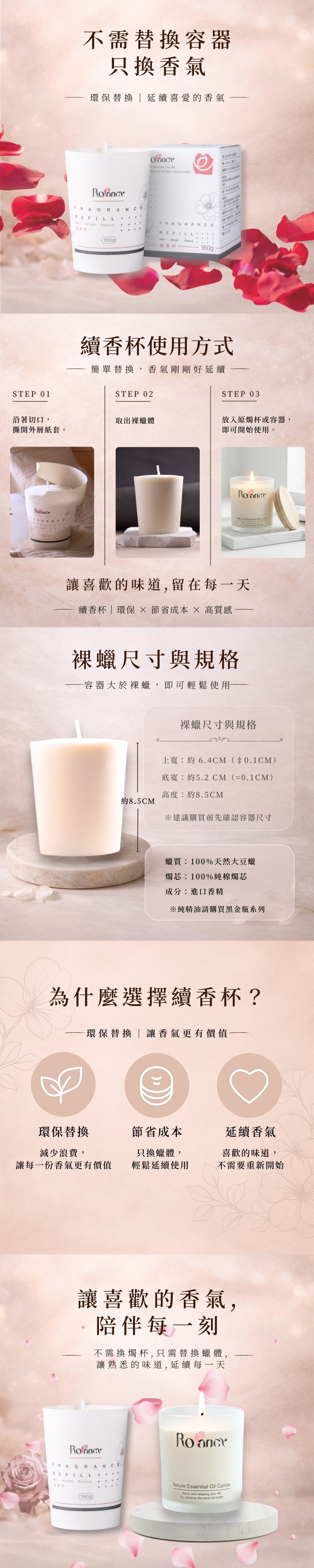 香氛不必因瓶罐而停止,續香杯讓香氣輕鬆延續。每顆皆為 150g 規格,僅適用於 容量 160g 以內的寬口容器,避免因容器過大或過小影響使用。沿著切口撕開外膜,將裸蠟整顆放入容器內,即可再次點亮熟悉的香氣。