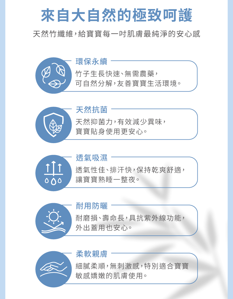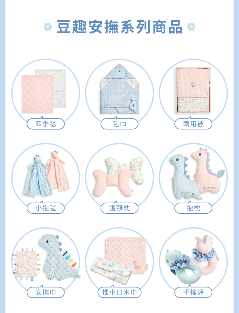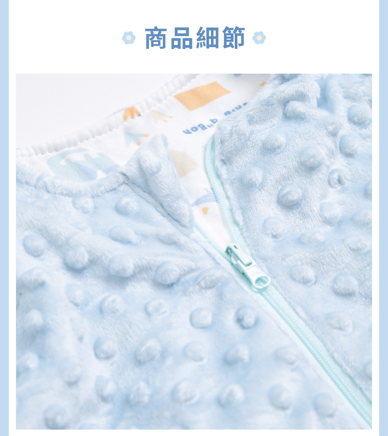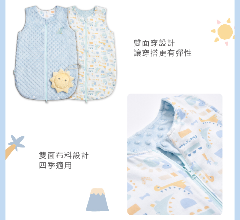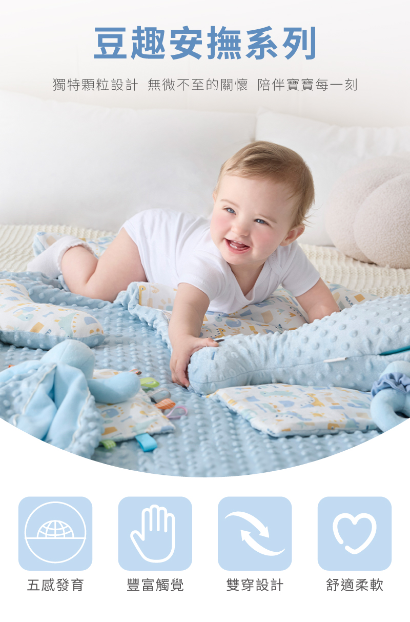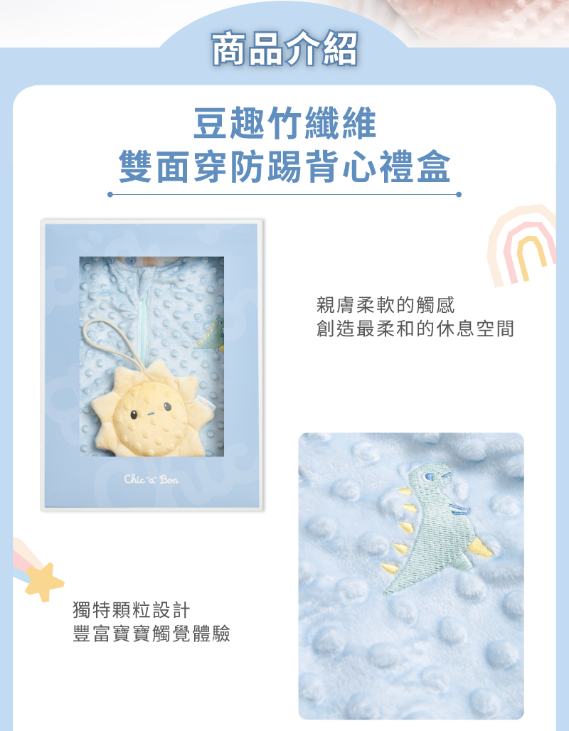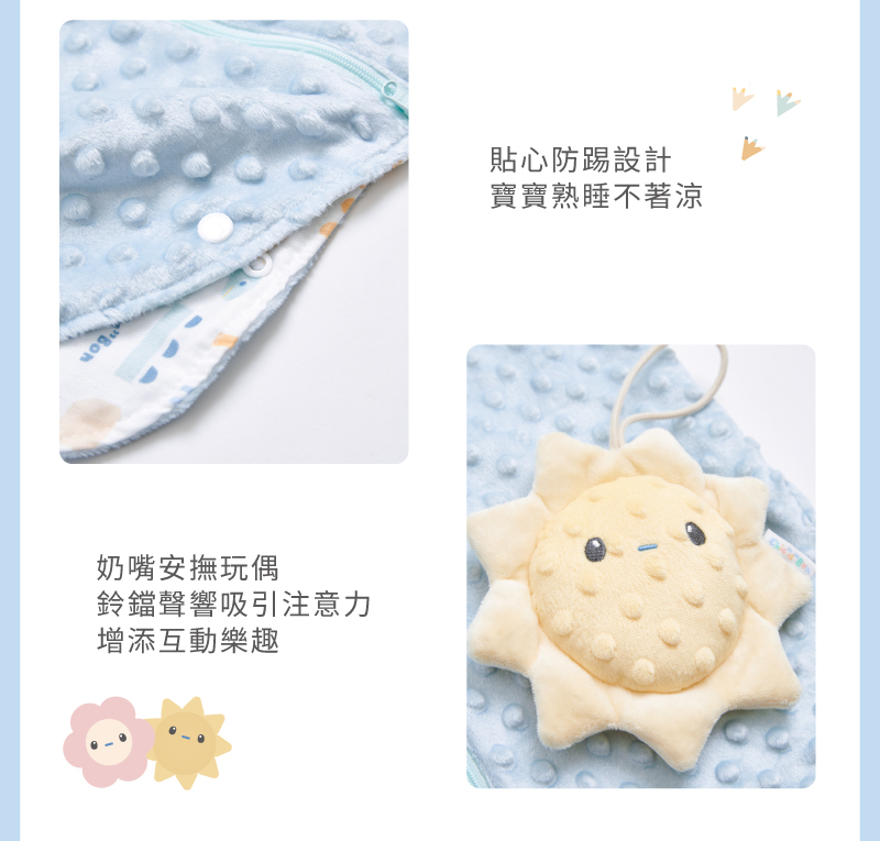 觸感柔軟‧雙面可穿‧全年舒適‧防踢設計1.獨特顆粒設計結合柔和色彩,啟發寶貝視覺與觸覺感官2.裡層竹纖維透氣吸濕、柔軟親膚,適合寶寶敏感肌膚3.雙面布料設計,適應不同季節變化,冬暖夏涼,讓穿搭更有彈性4.選用柔軟親膚材質,色調溫和,貼心守護寶貝的舒適與安全5.奶嘴安撫玩偶內藏鈴鐺,發出悅耳聲響,吸引注意力、激發探索好奇
