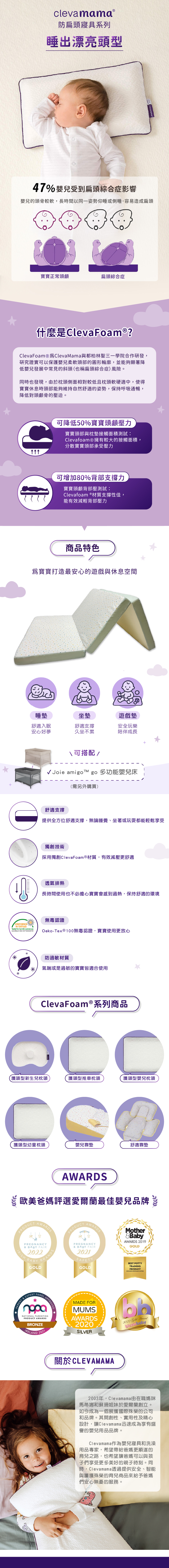 ■ 上半層 ClevaFoam® + 下半層 Reflex foam■ 舒適支撐 多用途地墊可在寶寶睡覺、坐著或玩耍時提供舒適的支撐。■ 獨創技術 採用獨創ClevaFoam® 材質製成,減壓更舒適。■ 透氣呵護 材質透氣排熱,久玩也不用怕寶寶過熱。■ Oeko-Tex® 100 無毒認證,寶寶使用更放心。防過敏材質,氣喘或是過敏的寶寶皆可使用。