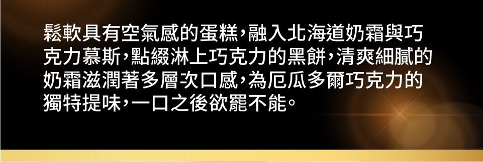 鬆軟具有空氣感的蛋糕,融入北海道奶霜與巧克力慕斯,點綴淋上巧克力的黑餅,清爽細膩的奶霜滋潤著多層次口感,為厄瓜多爾巧克力的獨特提味,一口之後欲罷不能。