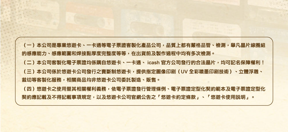 電子票證:悠遊卡、一卡通 票卡尺寸:寬 57 x 高 37 x 厚 10 mm 票卡材質:橡膠包裝:牛皮紙袋※卡片內不含儲值金