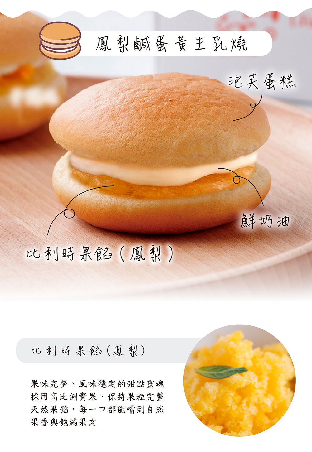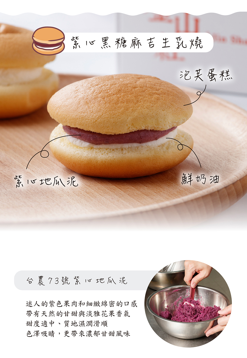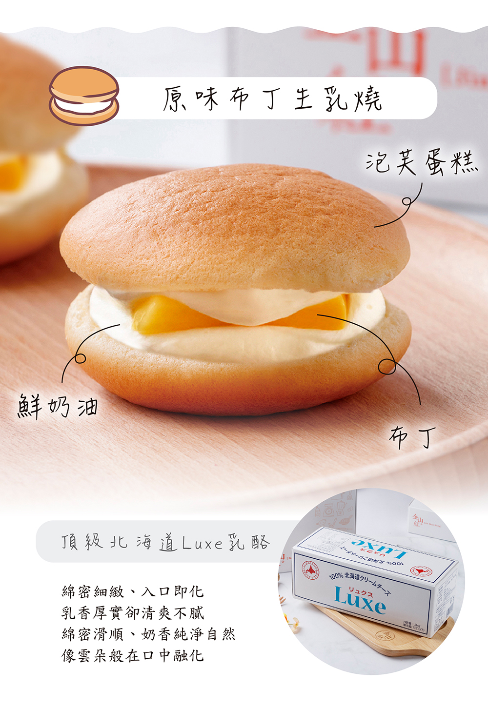 北海道生乳燒( 4入/盒) 口味:(一)原味布丁成分:布丁、雞蛋、鮮奶油、糖、牛奶、奶霜、麵粉、奶油、北海道鮮奶油乳酪、保濕纖維、塔塔粉過敏源:本產品含有奶類、雞蛋、小麥麩質成分(二)紅心麻吉成分:紅泥、雞蛋、鮮奶油、麻吉、牛奶、糖、麵粉、奶油、奶霜、北海道鮮奶油乳酪、格斯粉、保濕纖維、塔塔粉過敏源:本產品含有奶類、雞蛋、小麥麩質成分(三)紫心黑糖麻吉成分:雞蛋、紫泥、牛奶、鮮奶油、黑糖麻吉、糖、麵粉、奶油、奶霜、北海道鮮奶油乳酪、保濕纖維、格斯粉、塔塔粉過敏源:本產品含有奶類、雞蛋、小麥麩質成分(四)芋頭鹹蛋黃(葷食)成分:雞蛋、大甲芋頭、鮮奶油、糖、牛奶、鹹蛋黃、肉脯、奶油、麵粉、奶霜、北海道鮮奶油乳酪、保濕纖維、塔塔粉過敏源:本產品含有奶類、雞蛋、芋頭、小麥麩質成分(五)鳳梨鹹蛋黃(葷食)成分:雞蛋、加油冬瓜醬、鳳梨果餡、鮮奶油、鹹蛋黃、糖、牛奶、奶油、麵粉、奶霜、北海道鮮奶油乳酪、保濕纖維、塔塔粉過敏源:本產品含有奶類、雞蛋、小麥麩質成分(六)青蘋果成分:青蘋果果餡、雞蛋、奶霜、牛奶、糖、奶油、麵粉、鮮奶油、安佳乳酪、格斯粉、北海道鮮奶油乳酪、保濕纖維、塔塔粉過敏源:本產品含有奶類、雞蛋、小麥麩質成分(七)巧克力草莓成分:牛奶、雞蛋、草莓果餡、鮮奶油、奶霜、巧克力、糖、格斯粉、麵粉、奶油、北海道鮮奶油乳酪、保濕纖維、塔塔粉過敏源:本產品含有奶類、雞蛋、小麥麩質成分(八)蘭姆葡萄成分:蘭姆葡萄、雞蛋、奶霜、牛奶、糖、鮮奶油、奶油、麵粉、北海道鮮奶油乳酪、格斯粉、保濕纖維、塔塔粉過敏源:本產品含有奶類、雞蛋、小麥麩質成分