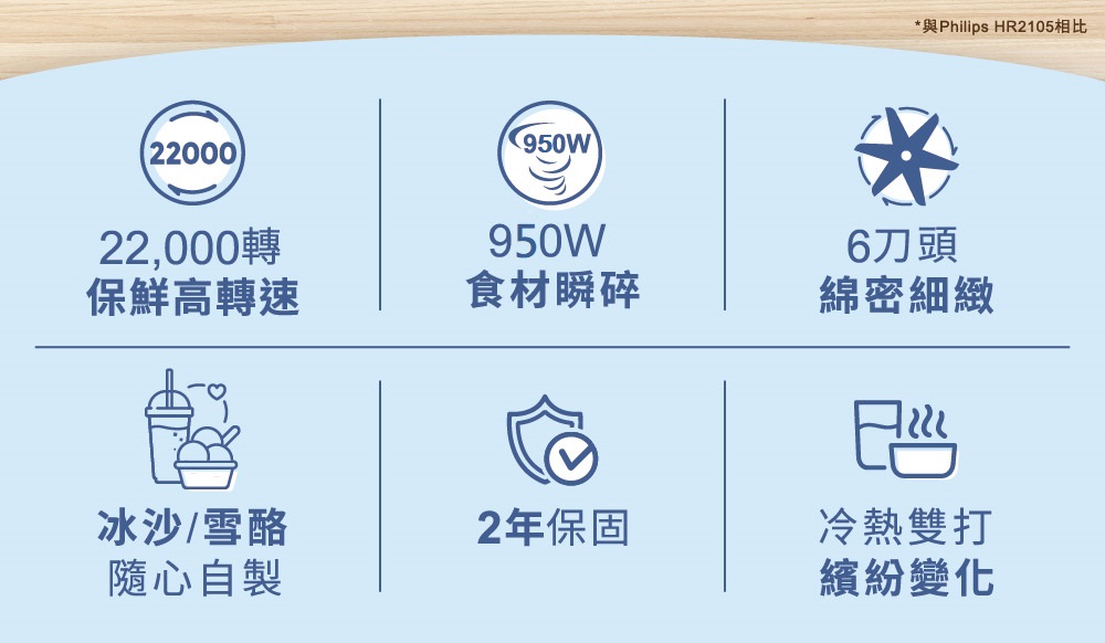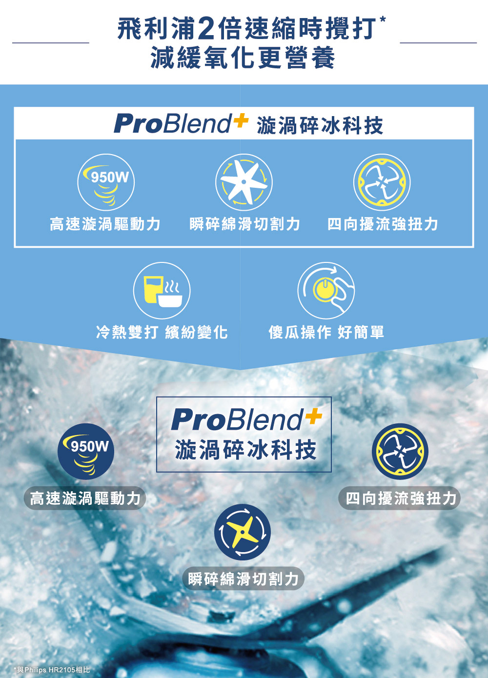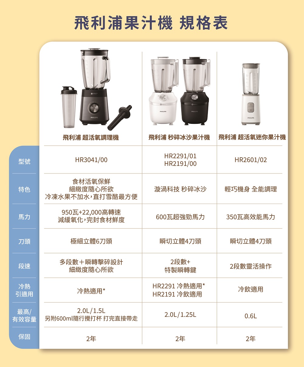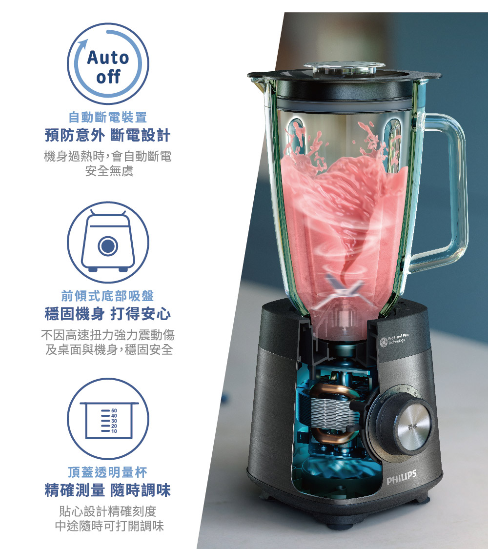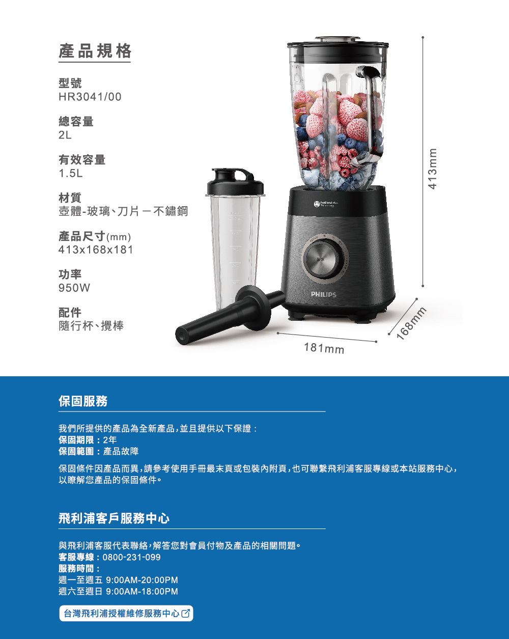 商品規格大容量2L玻璃壺體 六向刀頭技術,高轉速保留食材新鮮 瞬轉設計 輕鬆擊碎冰塊 多段數變速,口感隨時調整 600ml隨行杯,打完即可帶著走 貼心安全設計,自動斷電、前傾式底部吸盤穩固機身 可分離式刀組(可使用洗碗機清洗)商品規格品牌 PHILIPS 飛利浦類型 專業型調理機型號 HR3041/93產地 中國內部材質 高硼砂玻璃電壓 110V商品尺寸(材積) 18.1x16.8x41.3cm產品重量 4.8KG容量(公升) 1~2L回轉數(RPM) 20000~25000轉保固 2年消耗功率 900W~1000WBSMI許可字號 R3D904