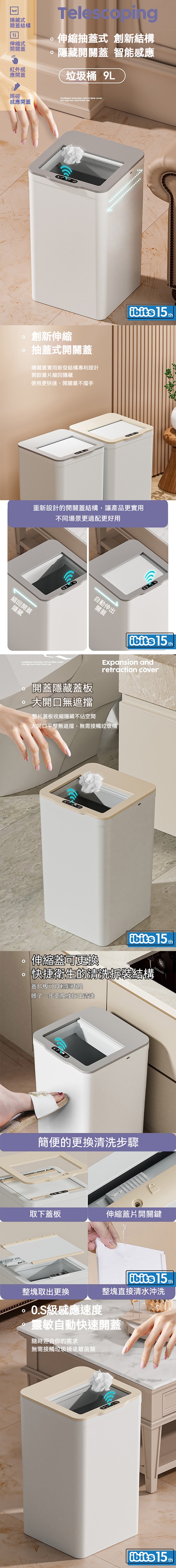 開蓋隱藏蓋板 大開口無遮擋整片蓋板收縮隱藏不佔空間,大開口平整無遮擋,無需接觸垃圾桶